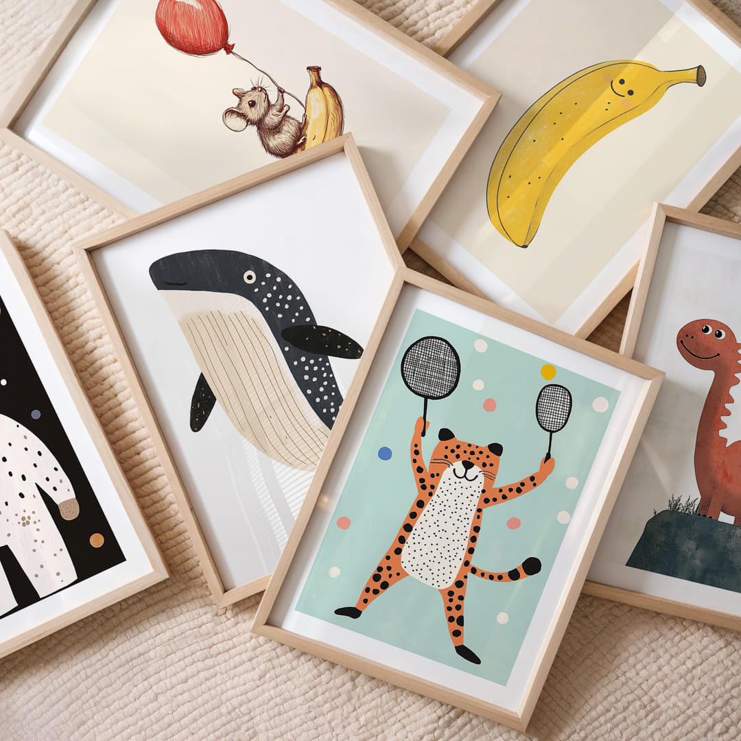 Dieses Wandbild versprüht mit seinen charmant illustrierten Tieren in leuchtenden Farben pure Lebensfreude und Verspieltheit. Die harmonischen Gemälde erzeugen durch ihre unterschiedlichen Gesichtsausdrücke und Formen eine dynamische Wirkung und verleihen dem Raum Energie und ein Gefühl von Freiheit. Perfekt, um Ihrem Zuhause einen Hauch von Humor und Lebendigkeit zu verleihen und gleichzeitig ein stimmiges und inspirierendes Element Ihrer Einrichtung zu schaffen.
