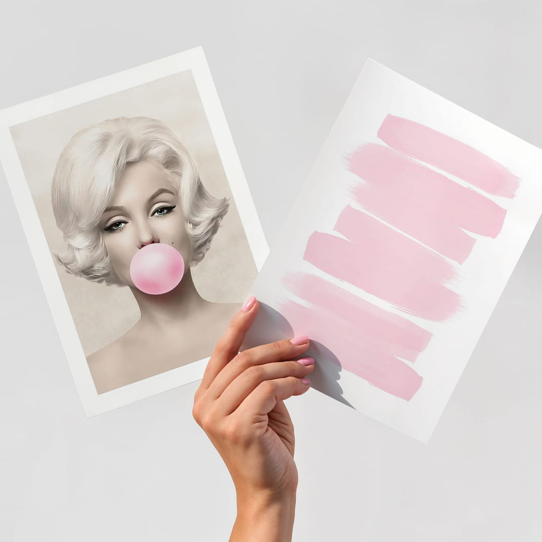 Die Kunstwand schafft eine harmonische Mischung, in der ein Künstlerporträt mit einer Blase aus Rosa und minimalistische Pinselstriche in sanften Pastelltönen nebeneinander stehen. Diese Kombination aus Schlichtheit und ikonischem Charakter verleiht dem Raum ein Gefühl von eleganter Modernität und kreativer Tiefe.