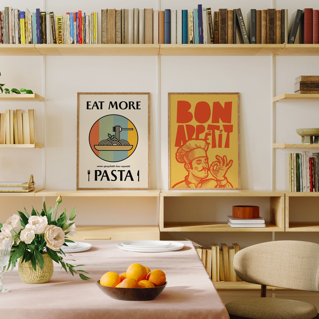 Die Wandbilder vermitteln mit ihren farbenfrohen und humorvollen Motiven ein Gefühl von Gourmet-Paradies, das die Freude am Essen und die kulinarische Leidenschaft hervorhebt. Die harmonische Kombination aus warmen Tönen und innovativem Design schafft eine elegante und inspirierende Atmosphäre. Diese ausdrucksstarke Kollektion verwandelt jeden Raum in einen lebendigen und einladenden Ort, an dem Essen und Kreativität aufeinandertreffen.