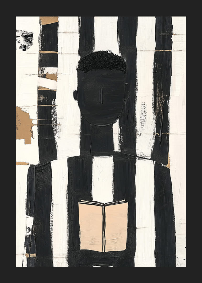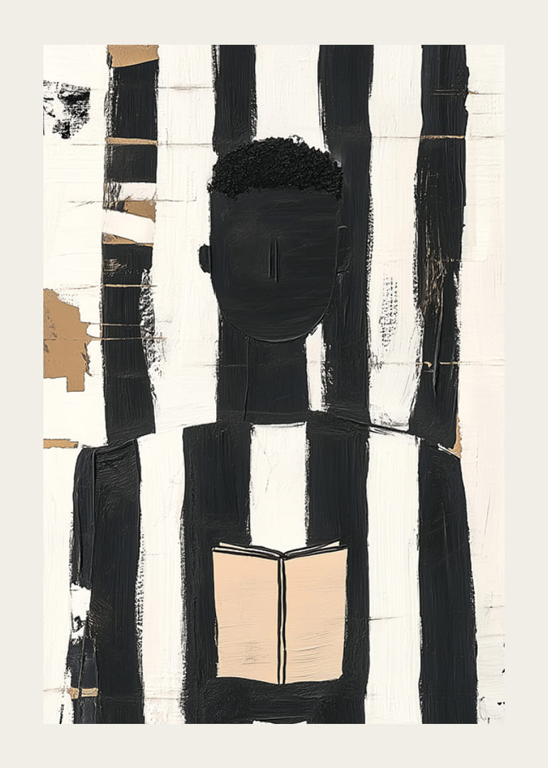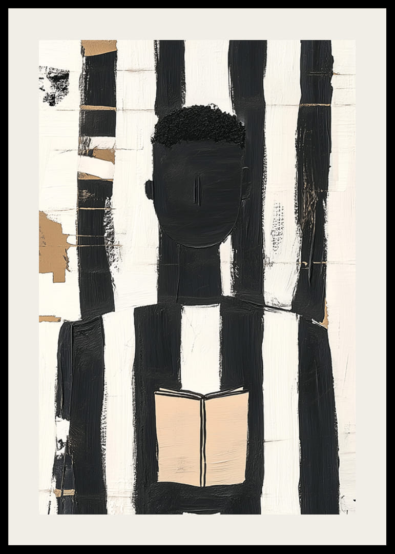 Dieses faszinierende Poster fällt durch seine kräftigen schwarzen und weißen Linien ins Auge, die eine anonyme, in eine Lektüre vertiefte Figur elegant einrahmen. Der minimalistische Stil vermittelt ein zeitloses Gefühl und die scharfen Kontraste zeigen die Kraft der Einfachheit.