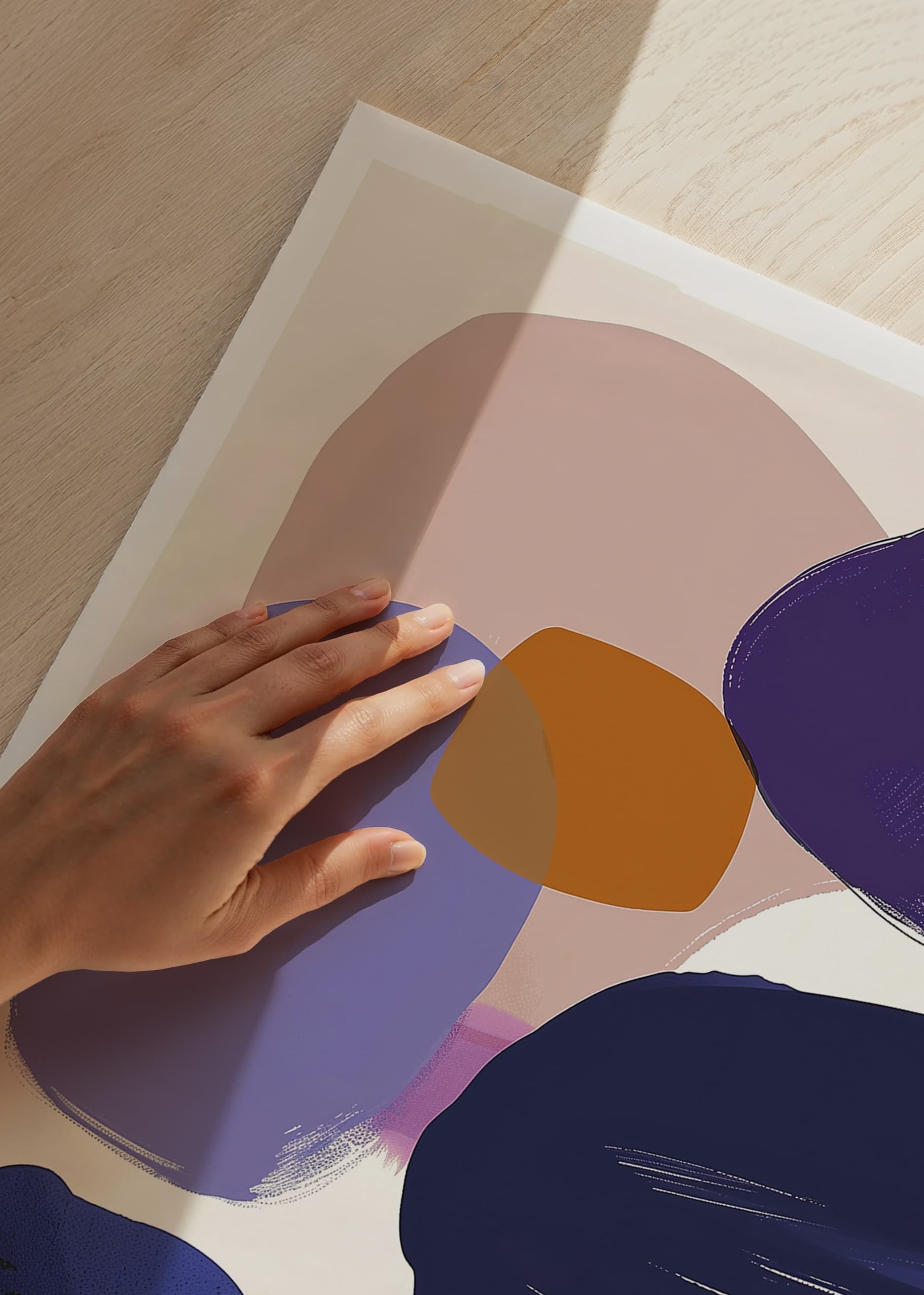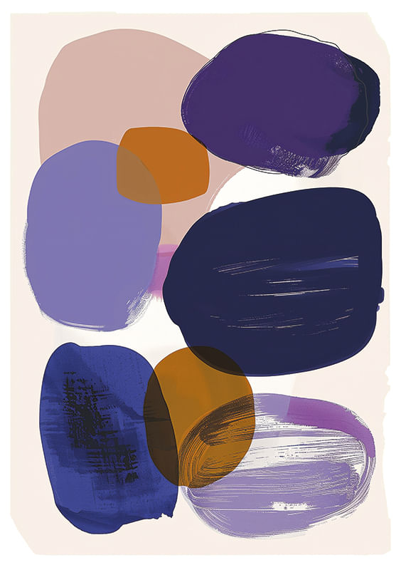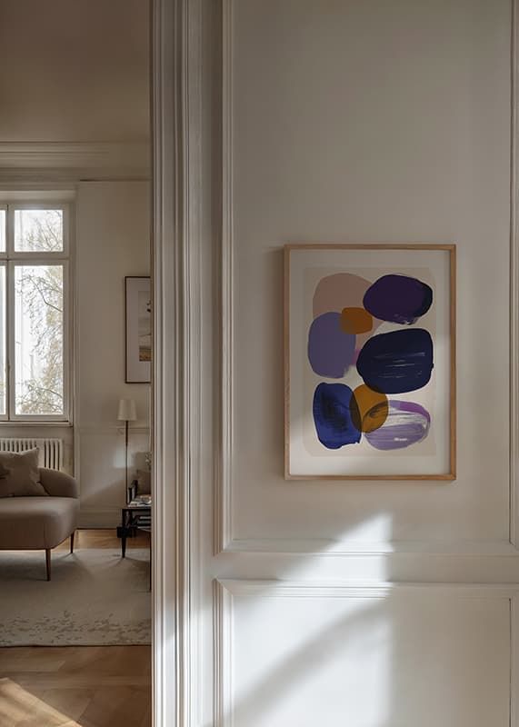Dieses Poster fällt durch seine sanften, harmonischen Farbblöcke in Blau, Lila und Ocker auf. Das abstrakte Motiv erzeugt ein stilvolles Gefühl von Ausgeglichenheit und Ruhe und lädt zum Nachdenken ein.