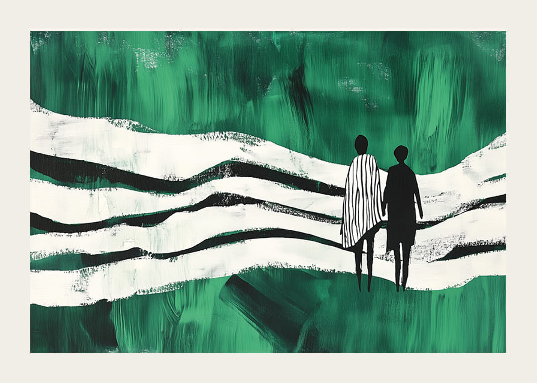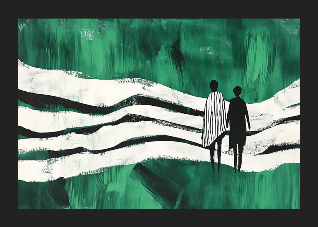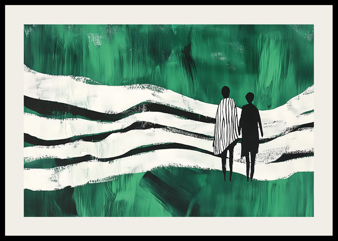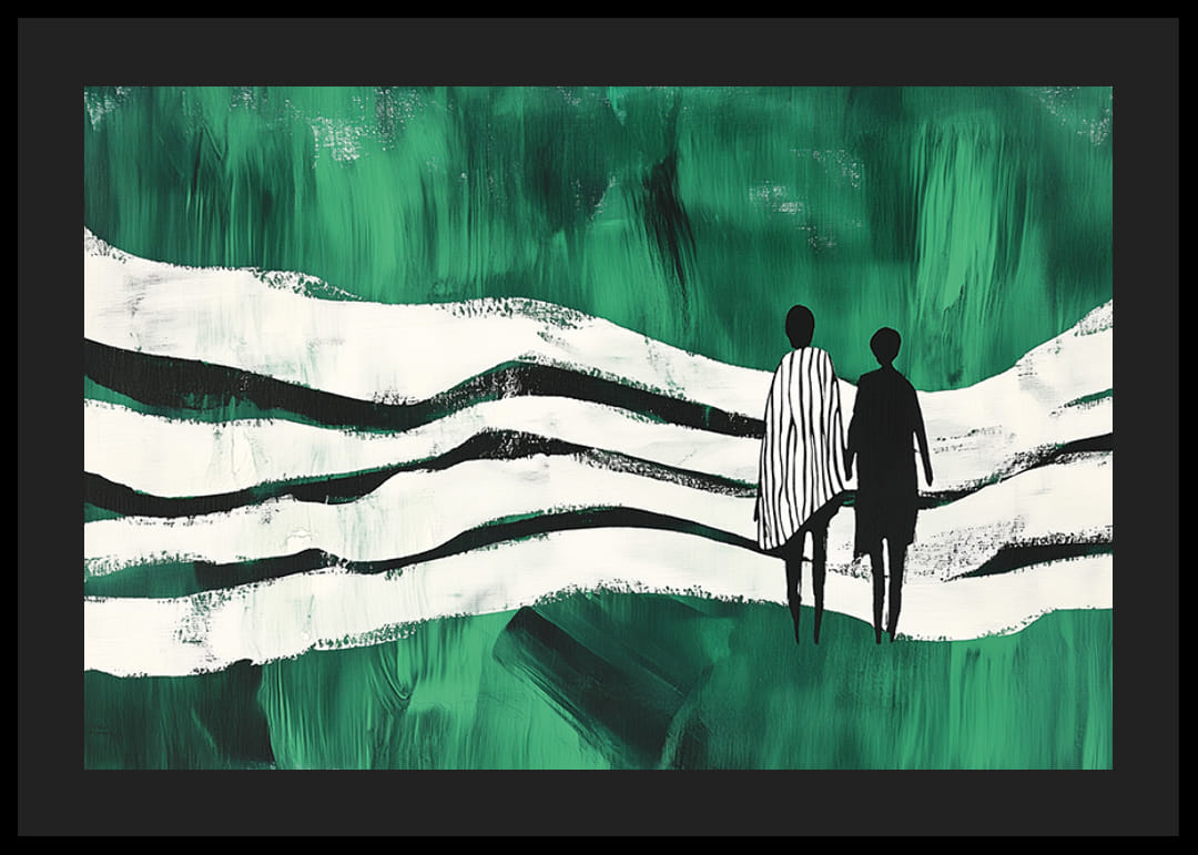 Dieses Poster fällt durch seinen Hintergrund in tiefen Grüntönen auf, während die Silhouetten zweier Figuren Hand in Hand durch eine abstrakte Landschaft gehen. Die schwungvolle Bewegung der Muster erzeugt ein Gefühl von Ruhe und Zusammengehörigkeit, das die Atmosphäre im Raum vertieft.
