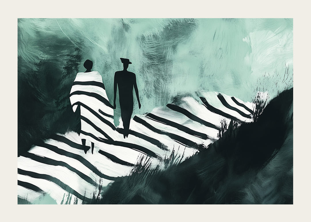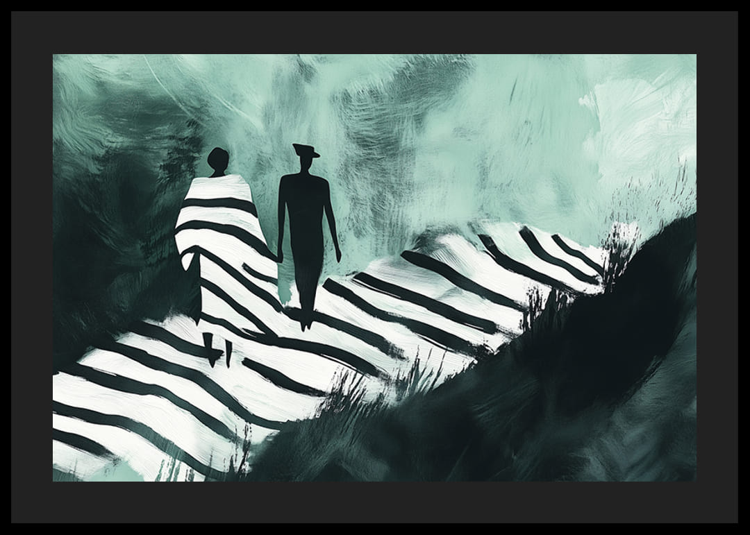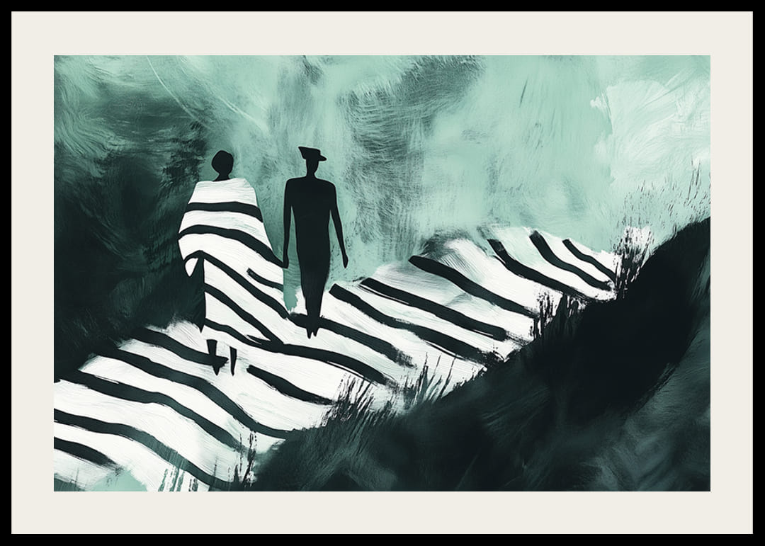 Dieses Poster zeigt zwei geheimnisvolle Silhouetten, die vor einem Himmel in sanften Grüntönen auf einem welligen, in ein schwarz-weißes Muster gehüllten Pfad entlanggehen. Mit einem Gefühl der Ruhe und Intimität erzeugt das Poster eine verträumte Atmosphäre, die das Gefühl von Verbundenheit und Gemeinschaft unterstreicht.