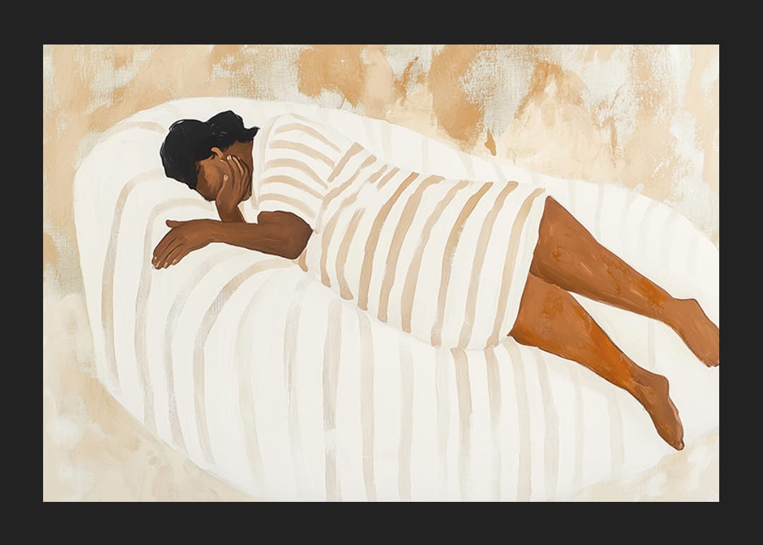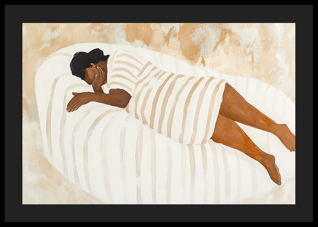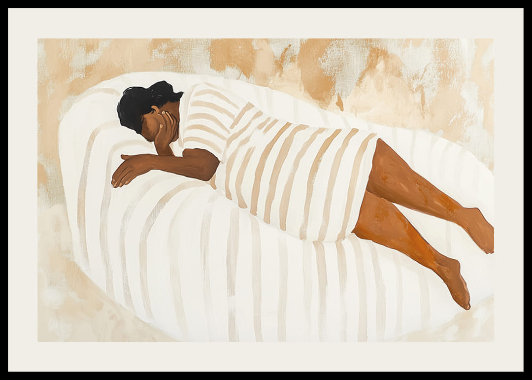 Dieses Poster vermittelt ein Gefühl vollkommenen Friedens, wenn eine Figur sicher auf einer sanft geformten Oberfläche ruht. Die warmen Erdtöne schaffen eine Atmosphäre der Ruhe und Gelassenheit und vermitteln dem Betrachter unmittelbar ein Gefühl des Friedens.
