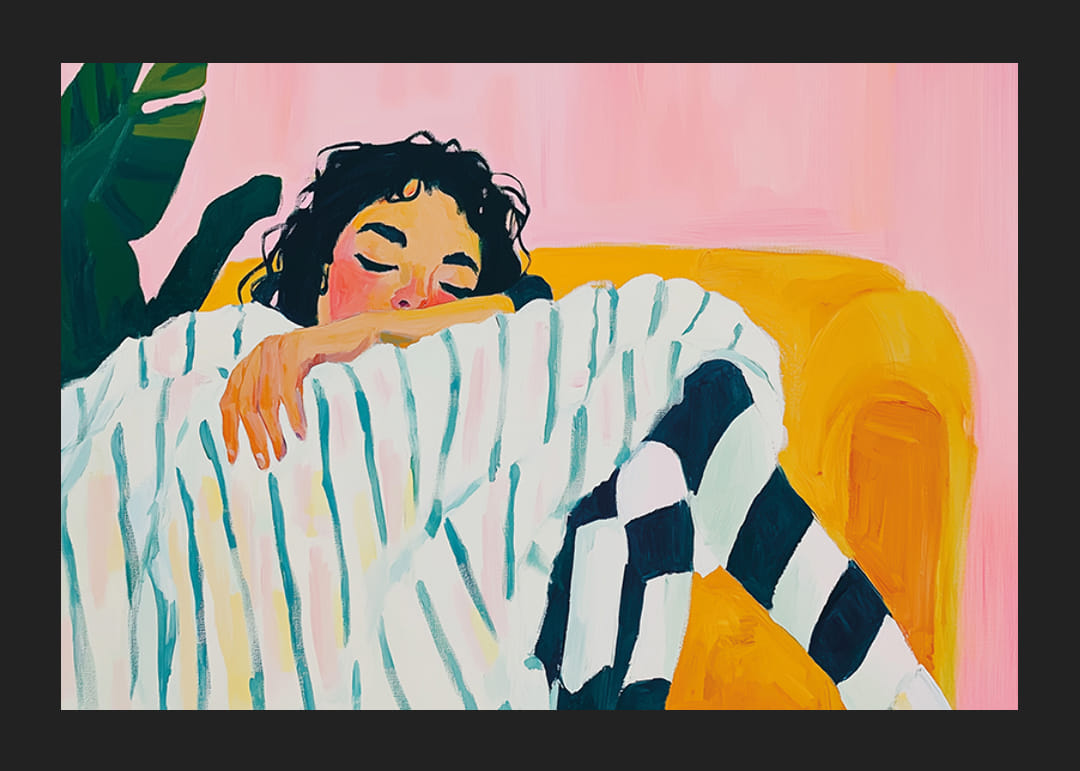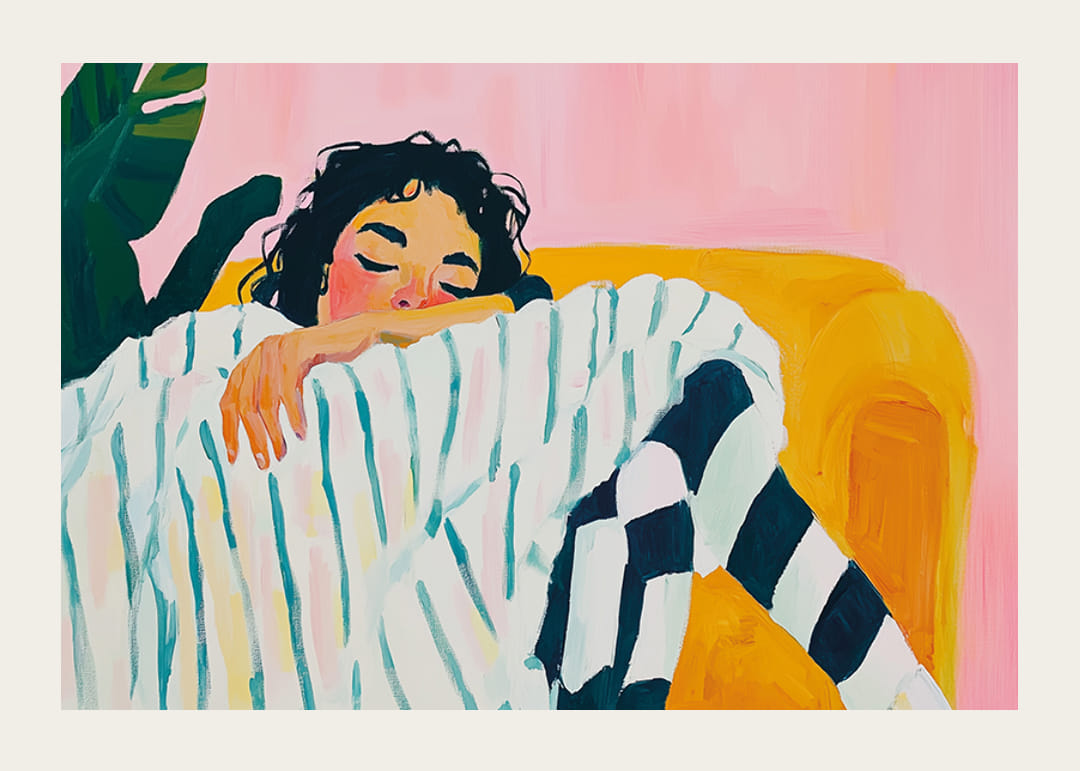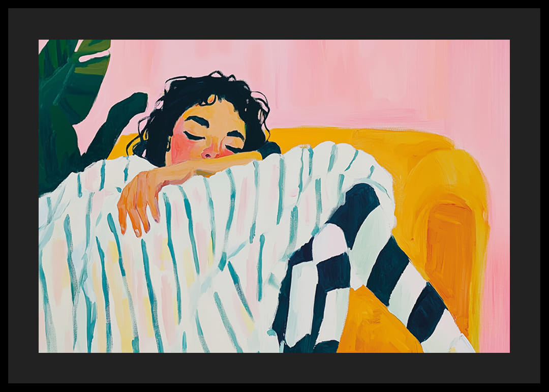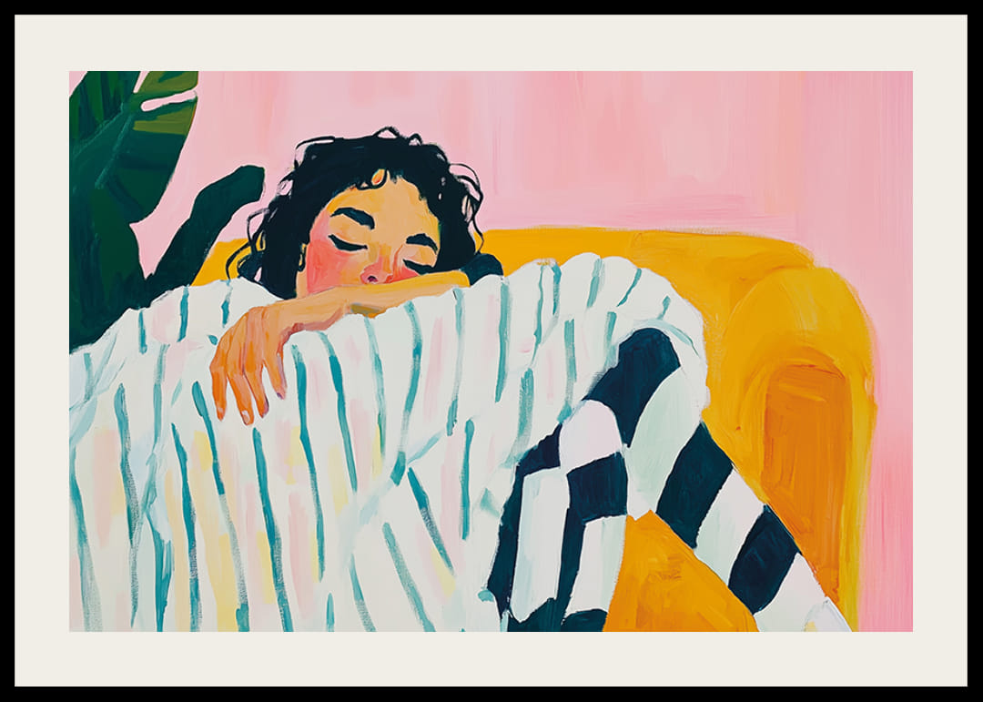 Dieses Poster vermittelt mit seinen sanften Pastellfarben und entspannten Motiven ein Gefühl der Ruhe und Entspannung. Die abgebildete Person ist in gestreifte Kleidung gehüllt und scheint zu träumen. Die starken Konturen und leuchtenden Farben verstärken die künstlerische Wirkung.