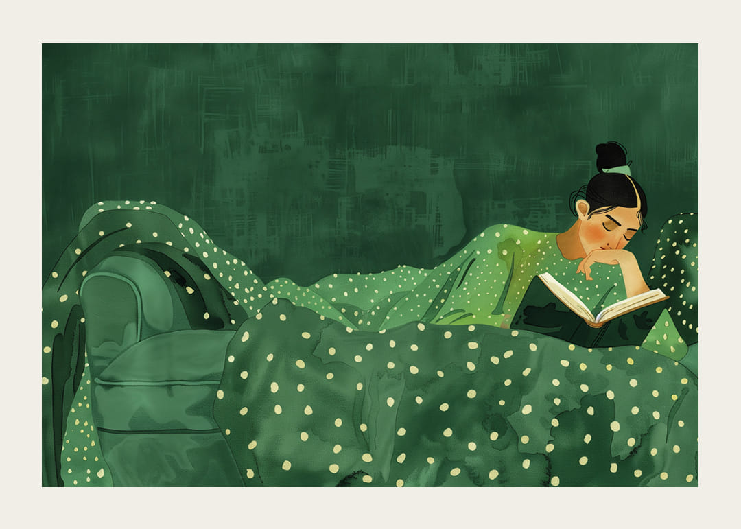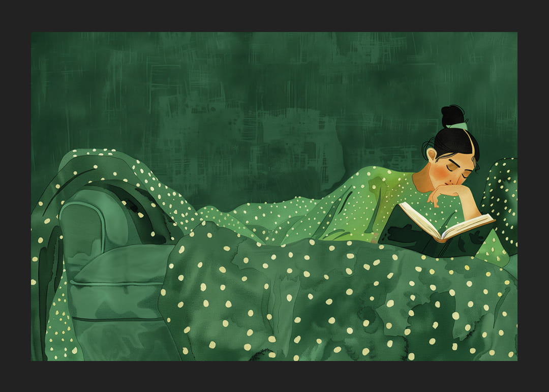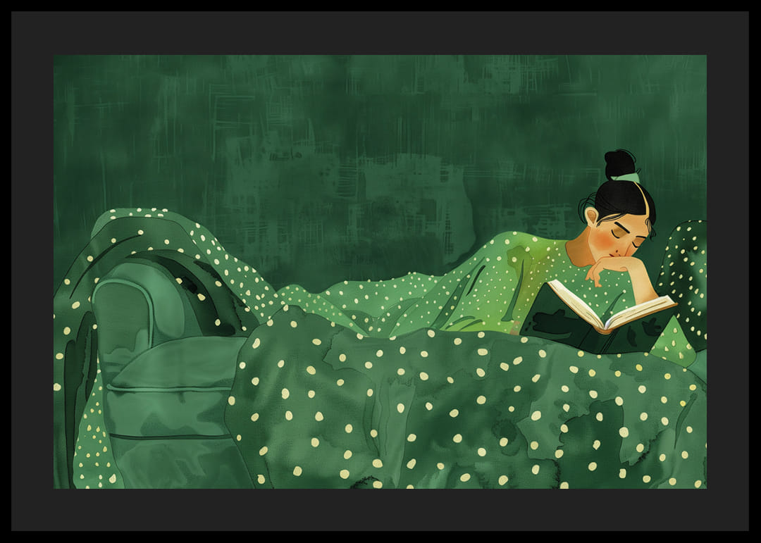 In einer harmonischen Mischung aus Grüntönen fängt dieses Poster eine Welt der Stille und Introspektion ein. Es zeigt eine Person, eingehüllt in weiche, gepunktete Stoffe, verloren in den Träumen eines Buches. Es lädt zu ruhigen Momenten ein, in denen die Zeit stillsteht. Als Teil Ihres Zuhauses schafft dieses Poster eine Oase der Ruhe, die Ihr Zuhause in einen Ort der Entspannung und Ruhe verwandelt.