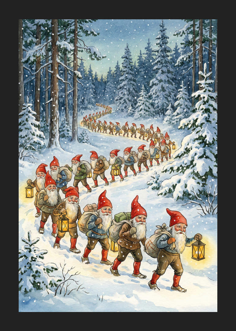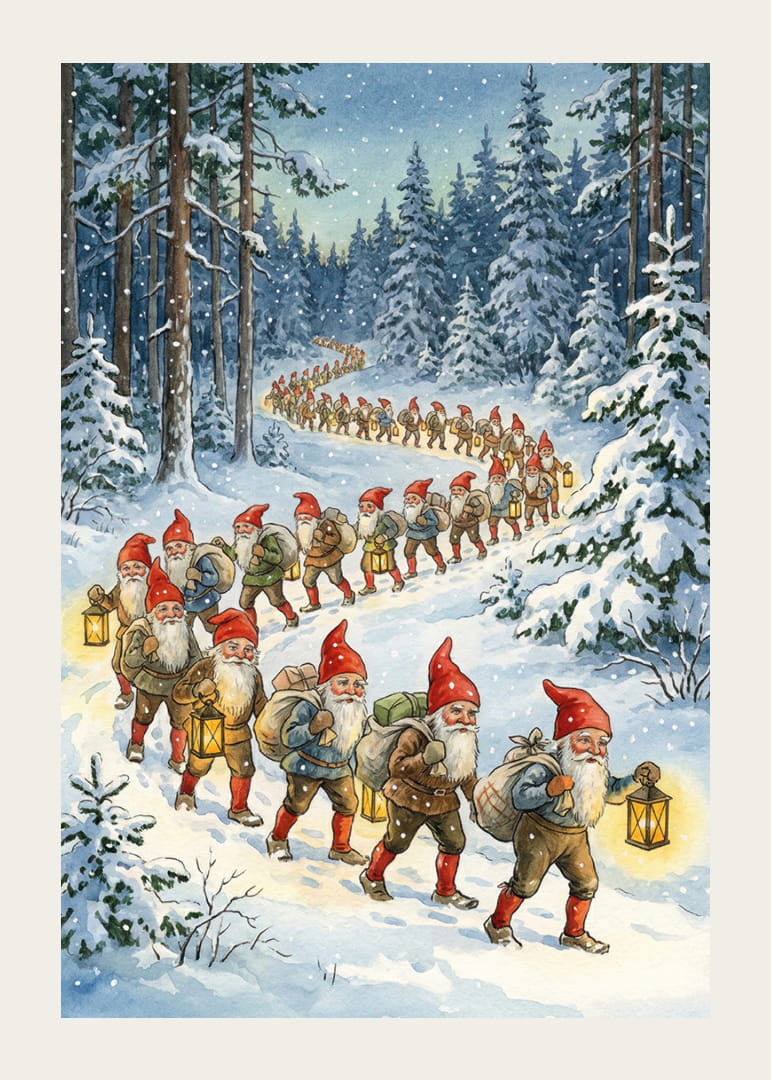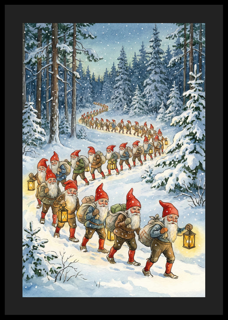 Dieses Poster zeigt eine bezaubernde Szene: Elfen wandern durch einen winterlichen Wald, umgeben von sanft fallendem Schnee. Ihre Laternen erhellen den frostigen Pfad und erzeugen eine magische, abenteuerliche Atmosphäre. Die rotkäppchenartigen Kapuzen bilden einen Kontrast zum kühlen, gedeckten Hintergrund und verbreiten Wärme und Freude. Das Poster verströmt in jedem Raum, in dem es hängt, eine zauberhafte Stimmung und ist perfekt, um die Schönheit der Wintermonate zum Leben zu erwecken.