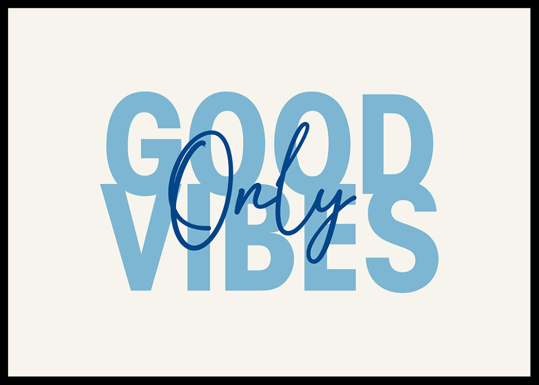Dieses Poster besticht durch seine beruhigenden Blautöne und seine optimistische Botschaft. Der Schriftzug „Nur gute Vibes“ in leuchtenden Buchstaben schafft eine Atmosphäre der Positivität und des Friedens. Es erinnert daran, sich mit Freude und Harmonie zu umgeben. Das Poster ist ideal, um jeden Raum aufzuhellen, und vermittelt ein Gefühl von Ausgeglichenheit und Ruhe, während es gleichzeitig zu einer positiven Lebenseinstellung inspiriert.