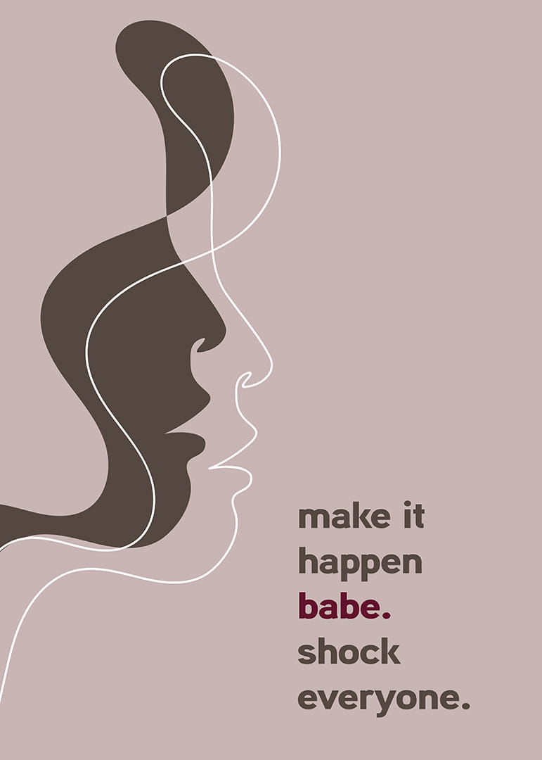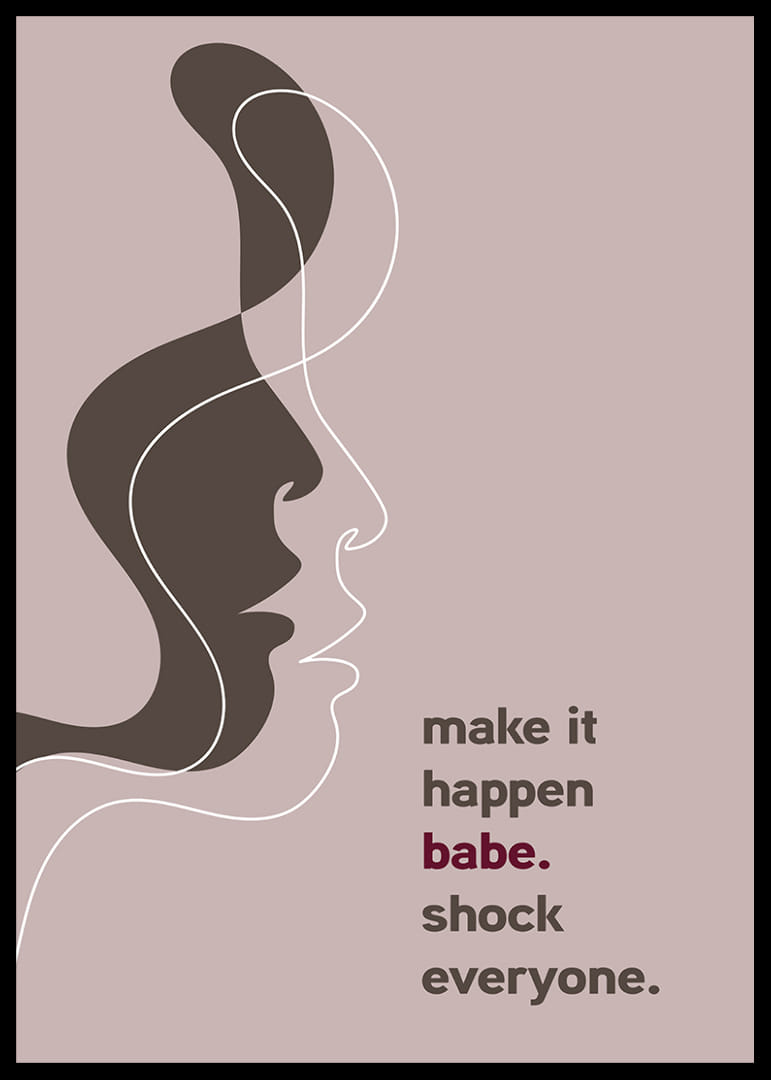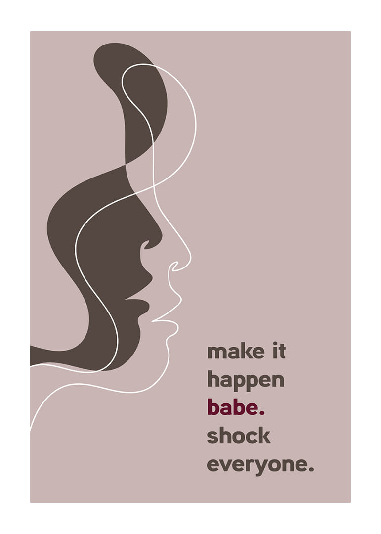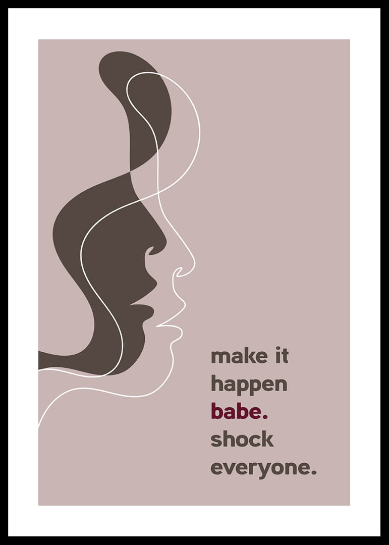 Dieses Poster besticht sofort durch seine klaren Linien und die kraftvolle Botschaft „Mach’s möglich, Baby. Überrasch alle.“ Es unterstreicht Entschlossenheit und Stärke. Die harmonische Farbpalette schafft eine beruhigende Atmosphäre, während die eleganten Kurven Dynamik und Kraft vermitteln. Ein perfektes Poster, um Ihr Zuhause oder Ihren Arbeitsplatz zu verschönern und zu inspirieren.