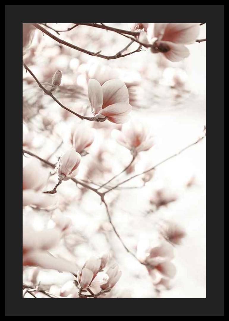 Magnolienzweige in blassen Rosatönen füllen das Motiv, eingefangen im sanften Gegenlicht vor einem hellen, diffusen Hintergrund. Die detailreichen Blütenblätter und dünnen Zweige erzeugen ein luftiges und natürliches Gefühl. Dieses Poster wirkt dezent und stilvoll und eignet sich für Wohnzimmer, Schlafzimmer oder Flur.