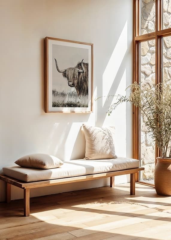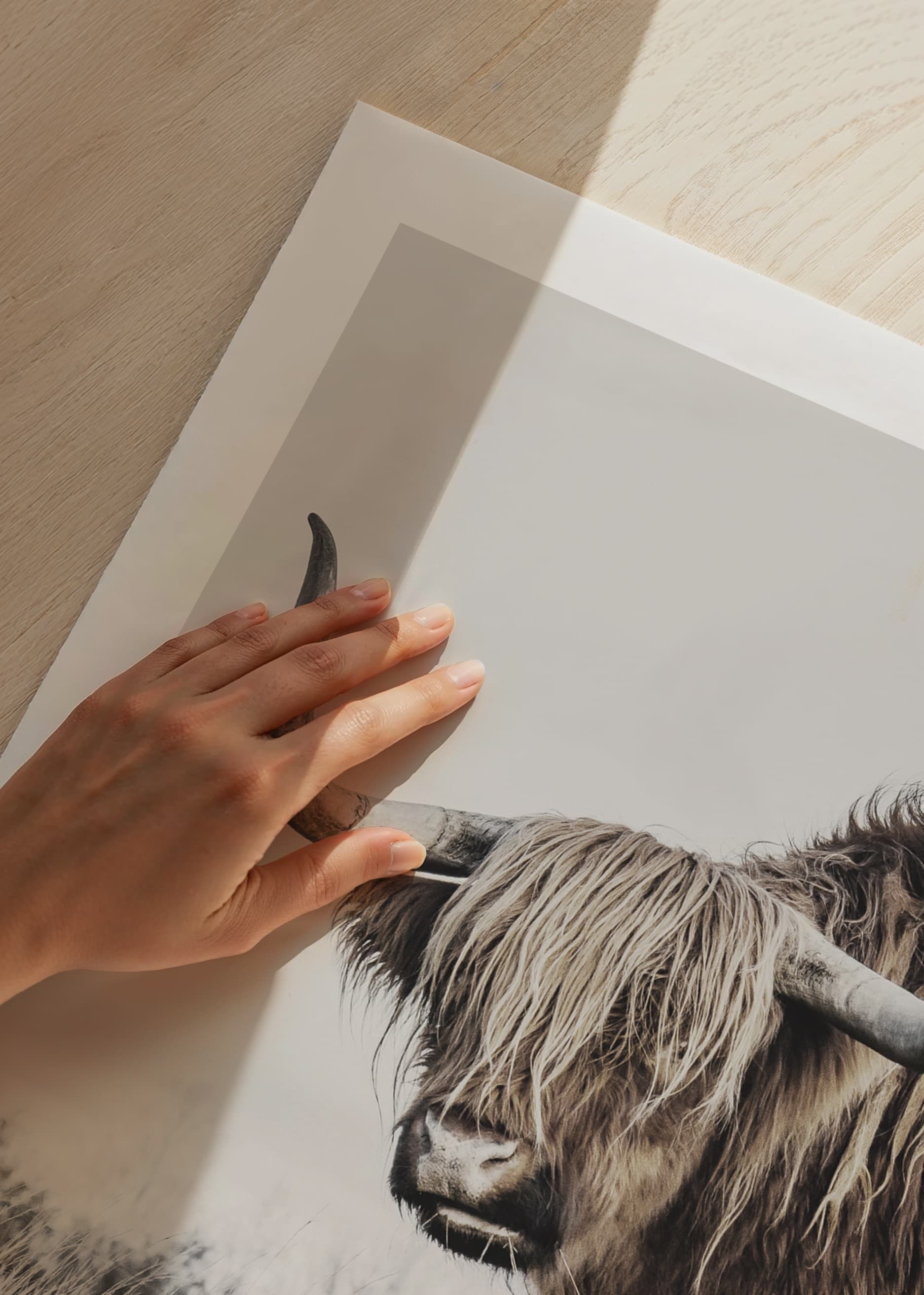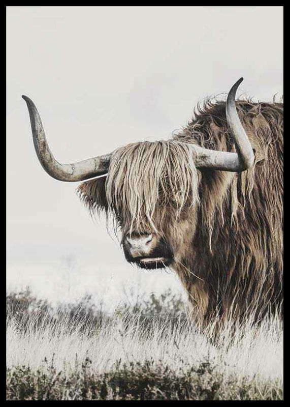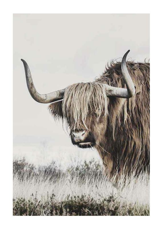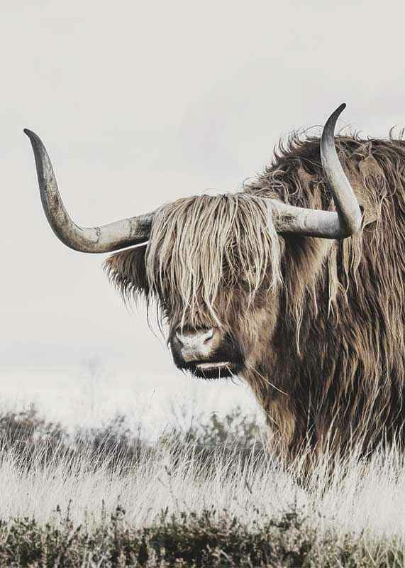 Nahaufnahme eines Hochlandrinds mit langem, welligem Fell und charakteristischen, geschwungenen Hörnern. Das Motiv ist in natürlichem Licht mit sanften, gedämpften Erdtönen vor einem schlichten Hintergrund eingefangen. Dieses Poster vermittelt nordisches Flair und verleiht sowohl dem Wohnzimmer als auch dem Arbeitszimmer eine rustikale, friedliche Note.