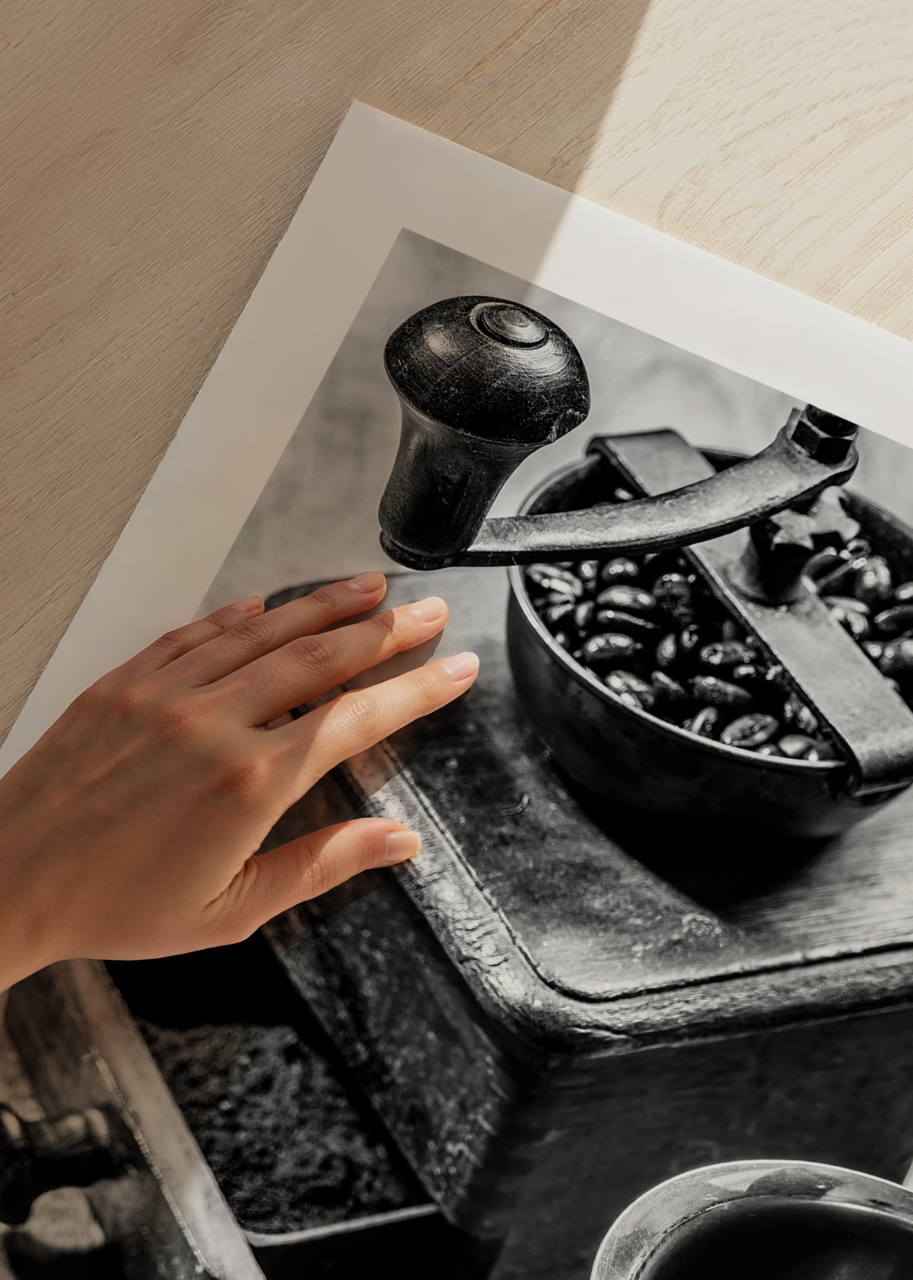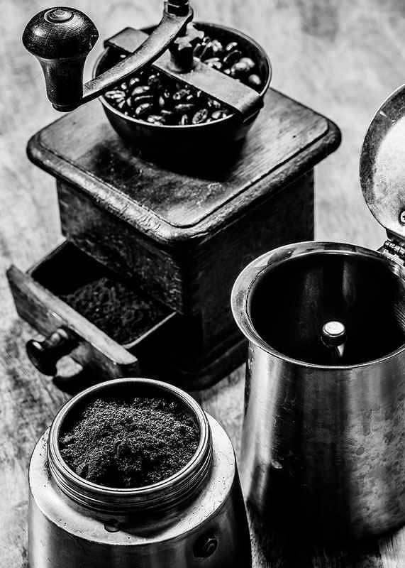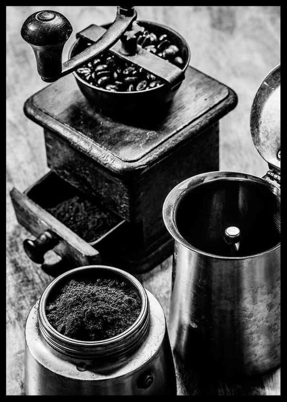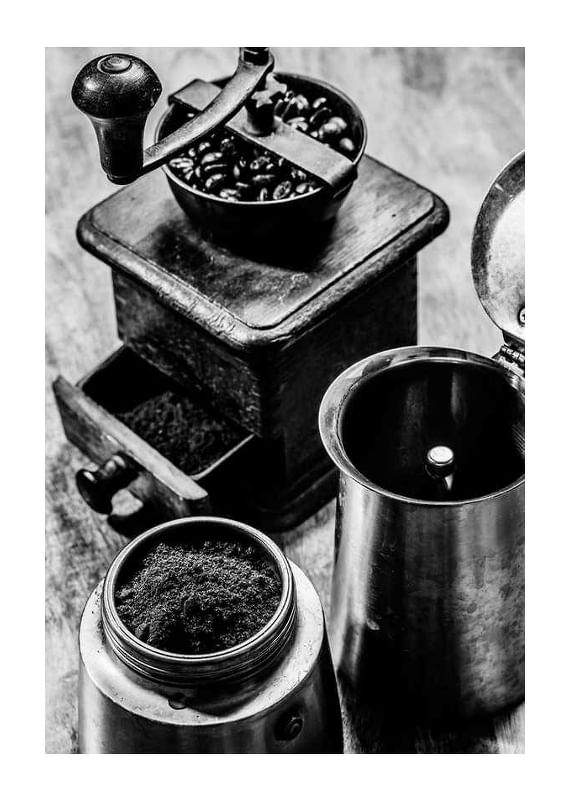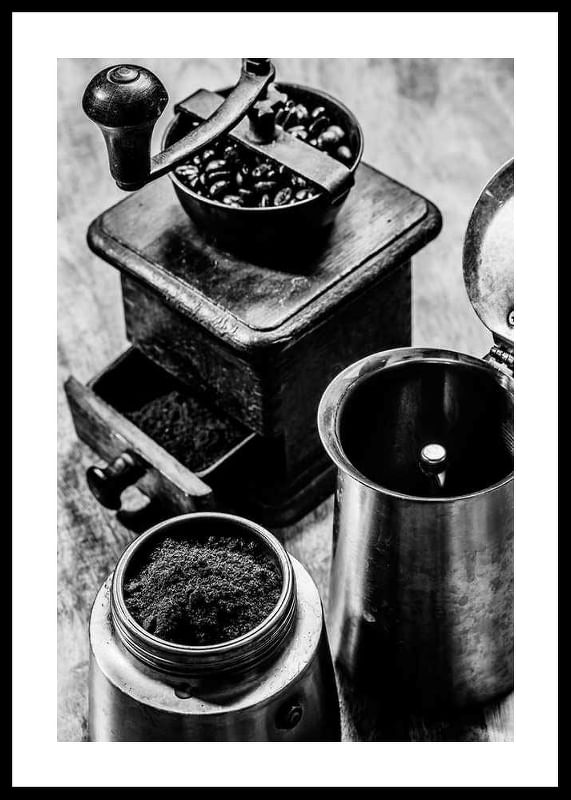 Ein klassisches Stillleben in Schwarz-Weiß mit einer antiken Kaffeemühle gefüllt mit Kaffeebohnen, frisch gemahlenem Kaffee in einem Metallbehälter und einer geöffneten Kaffeemaschine daneben. Sanfte Kontraste und die Patina des Holzes verleihen dem Motiv eine zeitlose Ausstrahlung. Das Poster passt perfekt in Küche oder Esszimmer und vermittelt ein Gefühl von Tradition und Handwerkskunst.