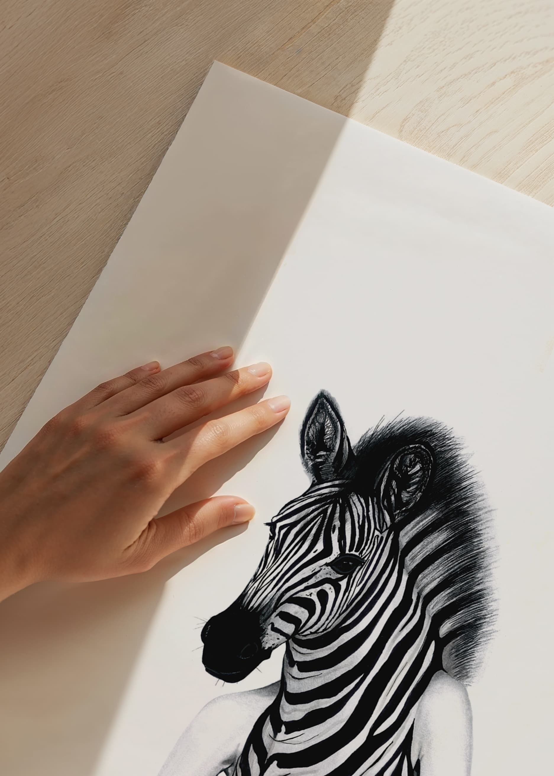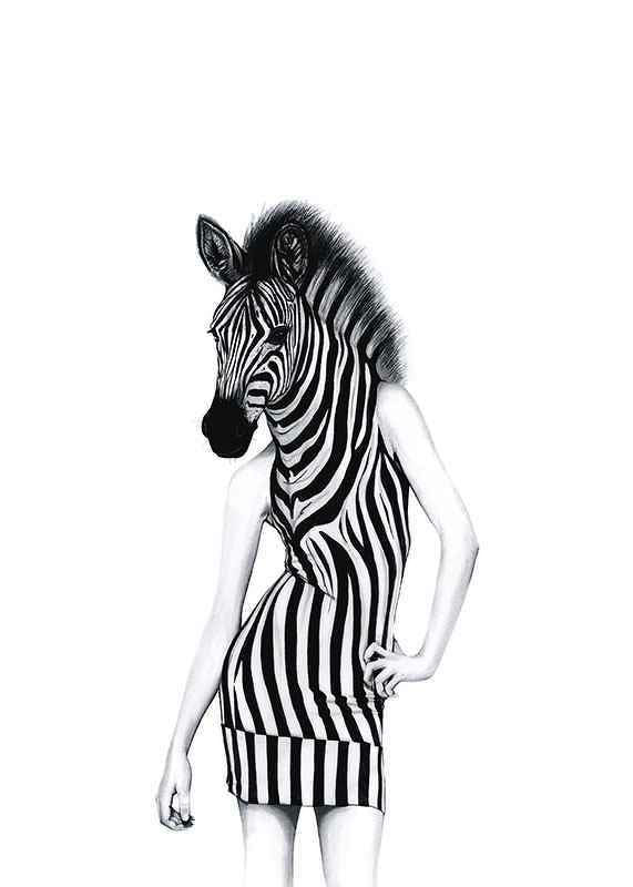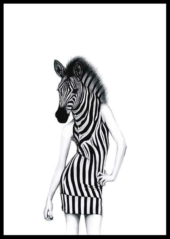 Weibliche Figur mit Zebrakopf und -körper, bekleidet mit einem engen Kleid mit Zebramuster. Handgezeichnete schwarz-weiße Linien verleihen dem Motiv eine grafische Note und einen klaren Kontrast zwischen der Figur und dem weißen Hintergrund. Die schwedische Illustratorin Sanna Wieslander kombiniert klassische Kunst mit modernen Elementen und mischt surrealen Humor mit detailliertem Bleistiftstil. So entsteht eine spielerische Interpretation, in der Alltag auf Kunstgeschichte trifft. Das Poster passt in moderne, kreative Räume, die einen persönlichen Akzent benötigen.