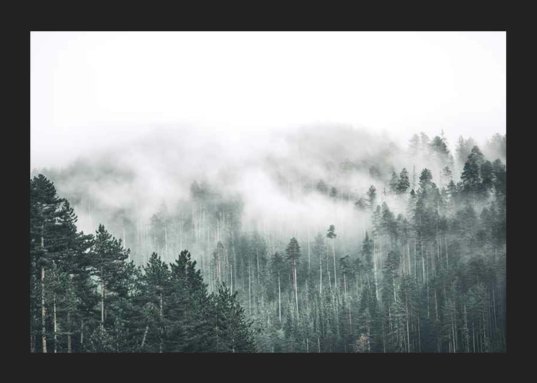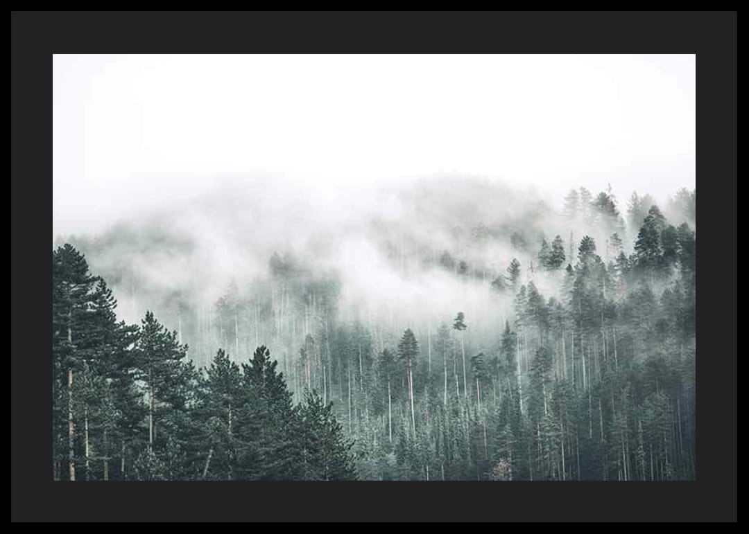 Dichter Nadelwald ist in Nebel gehüllt, der die Baumkronen einhüllt und den Horizont verschwimmen lässt. Sanfte Grün- und Grautöne dominieren das Motiv und verleihen ihm eine ruhige Ausstrahlung. Dieses Poster passt in Räume, in denen natürliche und dezente Elemente gefragt sind und zu einer ruhigen Atmosphäre beitragen.