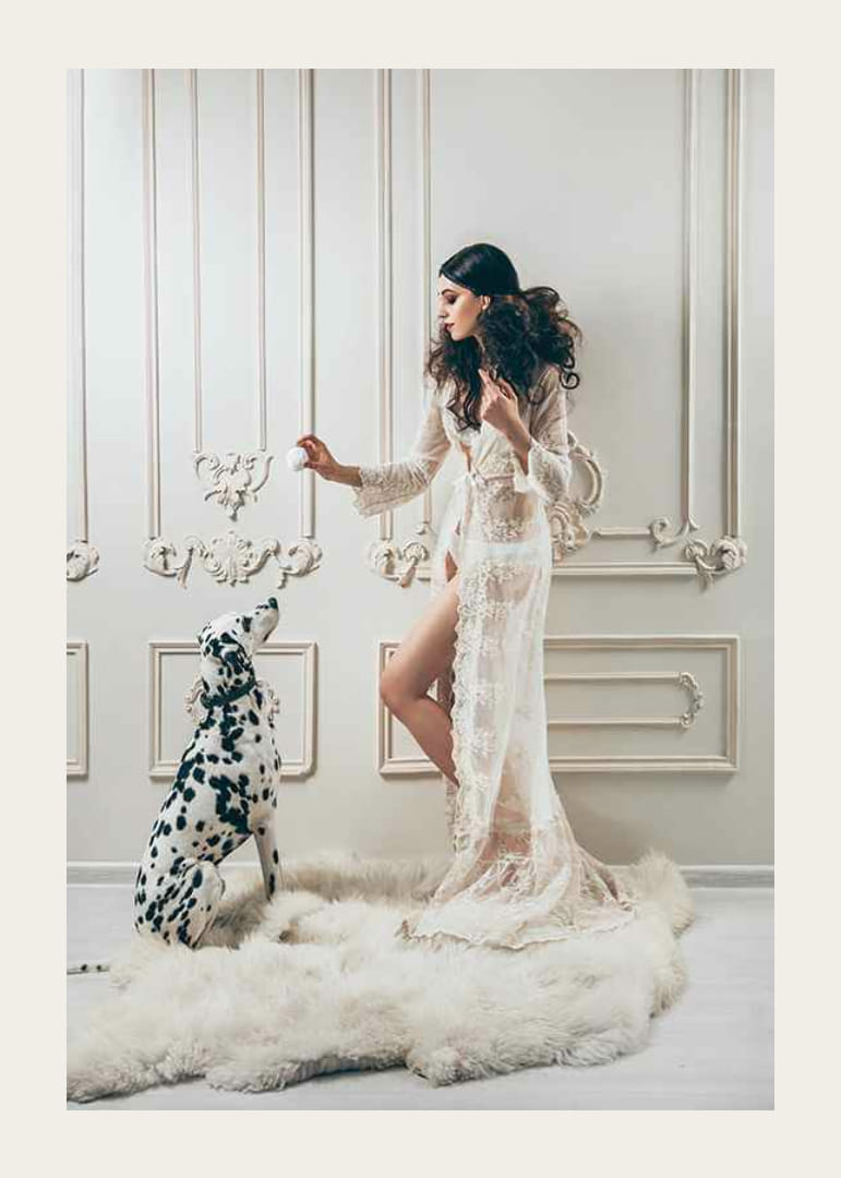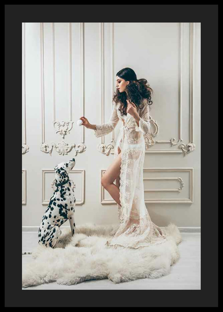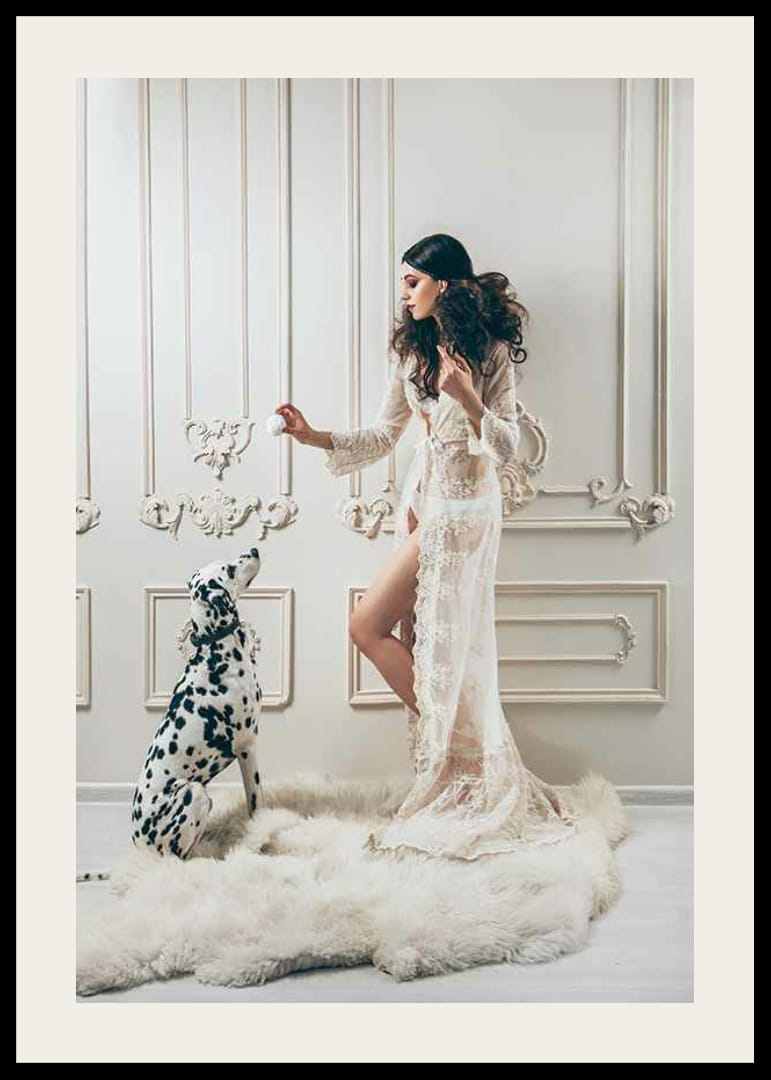 Eine Frau in einem langen, transparenten Spitzenkleid steht mit einem Dalmatiner auf einem weichen, weißen Teppich. Der Hintergrund ist eine klassisch, farbenfroh dekorierte Wand mit kunstvollen Details. Dieses Poster vermittelt ein Gefühl von anspruchsvoller Mode und eignet sich für Räume, in denen Sie einen geschmackvollen Eindruck hinterlassen möchten.