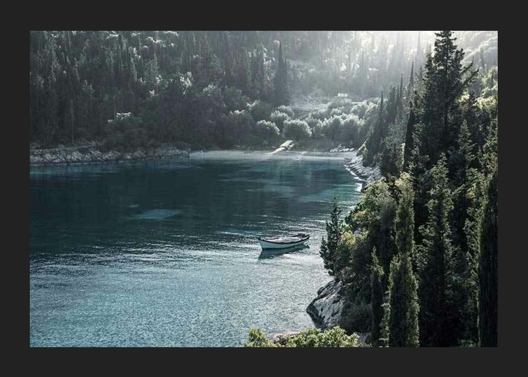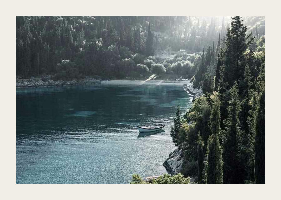 Ein einsames Boot schaukelt auf klarem, türkisfarbenem Wasser, umgeben von dichten, grünen Bäumen entlang der wunderschön eingerahmten Bucht von Foki Beach. Das Licht fällt durch die Kiefern und erzeugt sanfte Kontraste in der Landschaft. Dieses von der Natur inspirierte Poster eignet sich perfekt für ein Wohn- oder Arbeitszimmer, in dem eine ruhige und elegante Atmosphäre gewünscht ist.