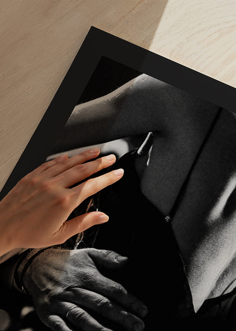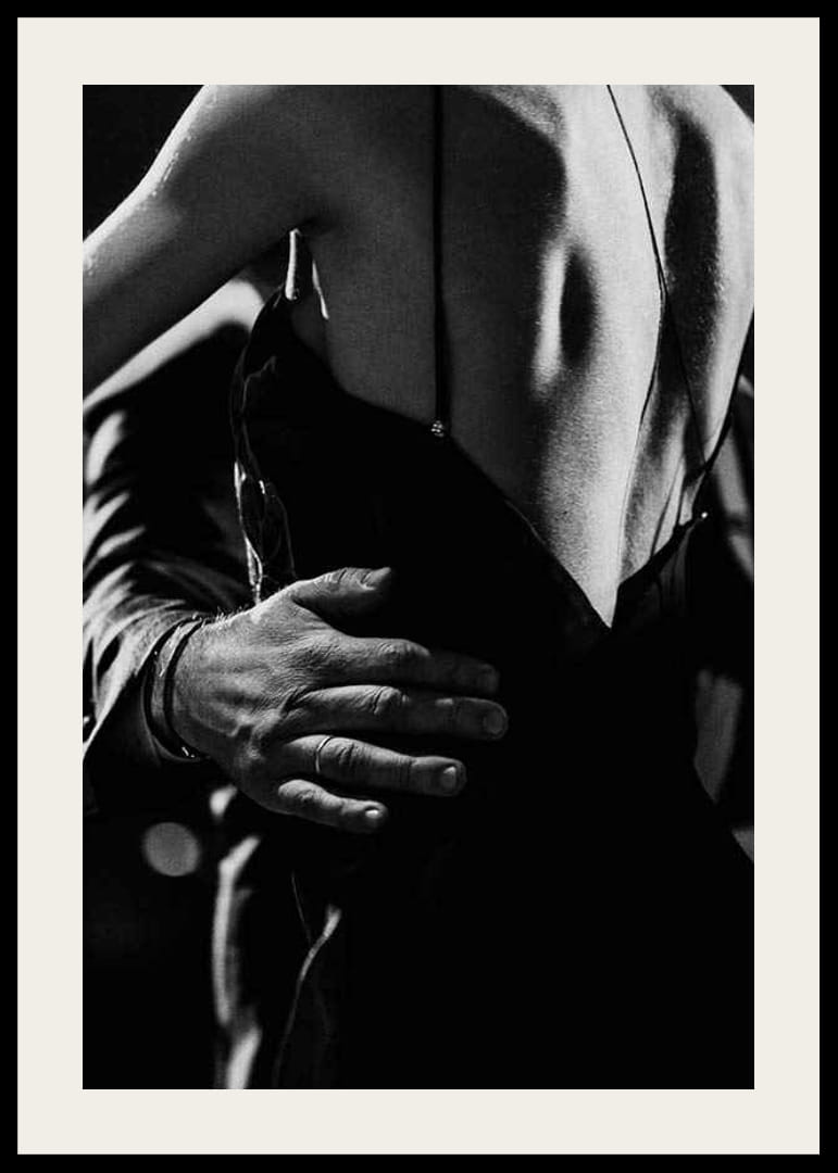 Nahaufnahme einer Frau in elegantem Kleid und mit nacktem Rücken, die während eines Tangotanzes von der Hand eines Mannes umarmt wird. Die Schwarz-Weiß-Fotografie fängt den Kontrast zwischen Haut und Stoff und die intime Geste des Tanzes ein. Ein Poster, das beispielsweise einem Wohnzimmer oder Flur eine stilvolle und anspruchsvolle Atmosphäre verleiht.