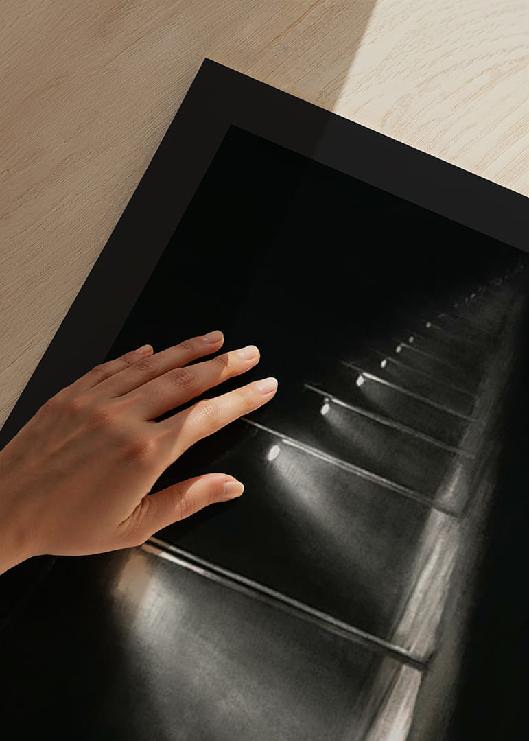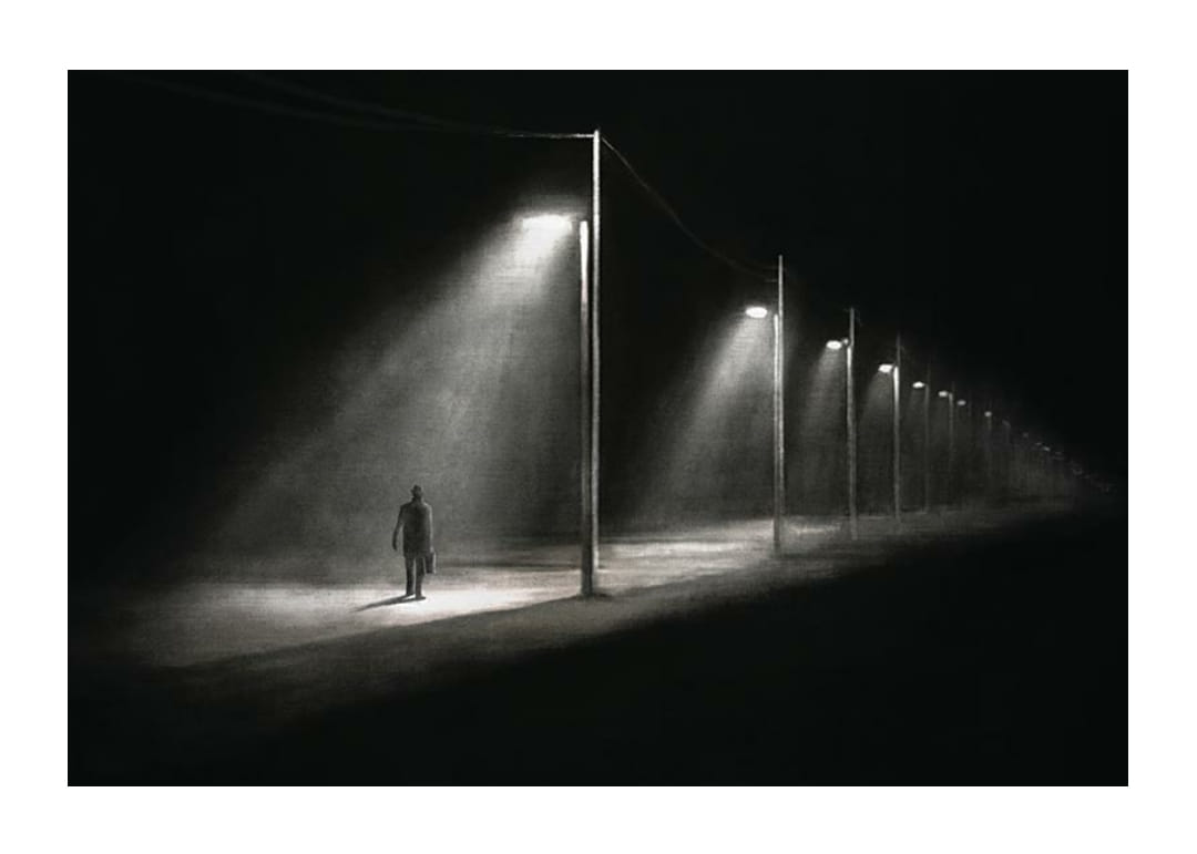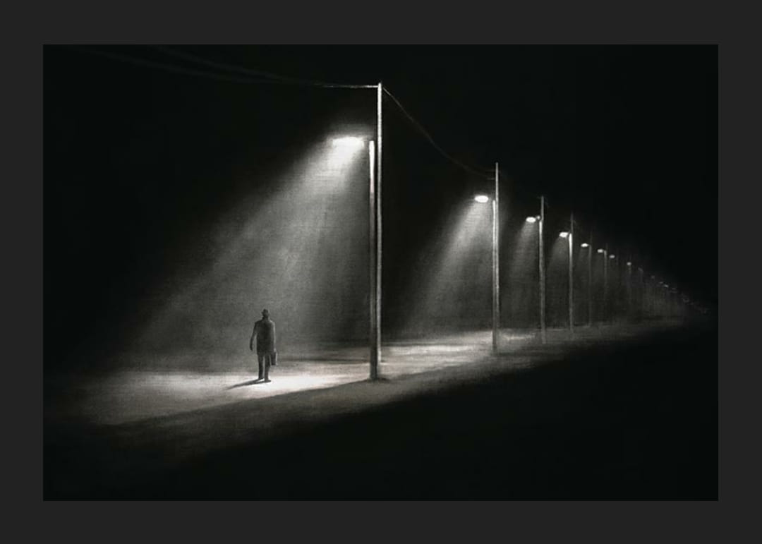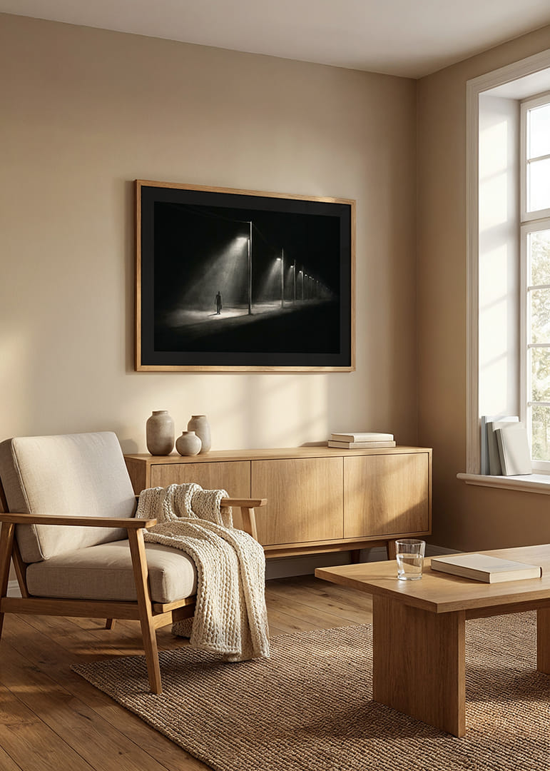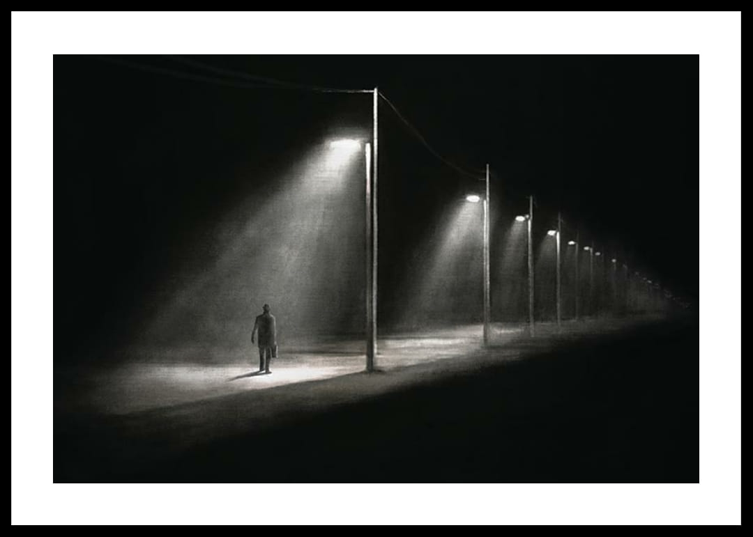 Die Silhouette eines einsamen Mannes, der nachts unter einer Reihe beleuchteter Straßenlaternen eine verlassene Straße entlanggeht. Starke Hell-Dunkel-Kontraste erzeugen einen grafischen Effekt, der das Gefühl der Abgeschiedenheit verstärkt. Dieses Poster verleiht beispielsweise einem Flur oder Wohnzimmer einen greifbaren und stimmungsvollen Ausdruck.