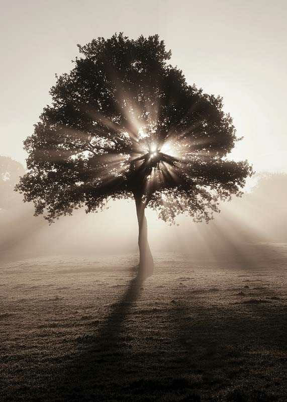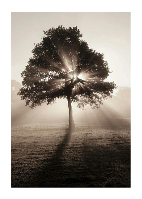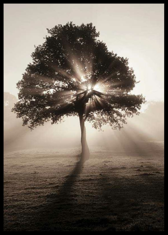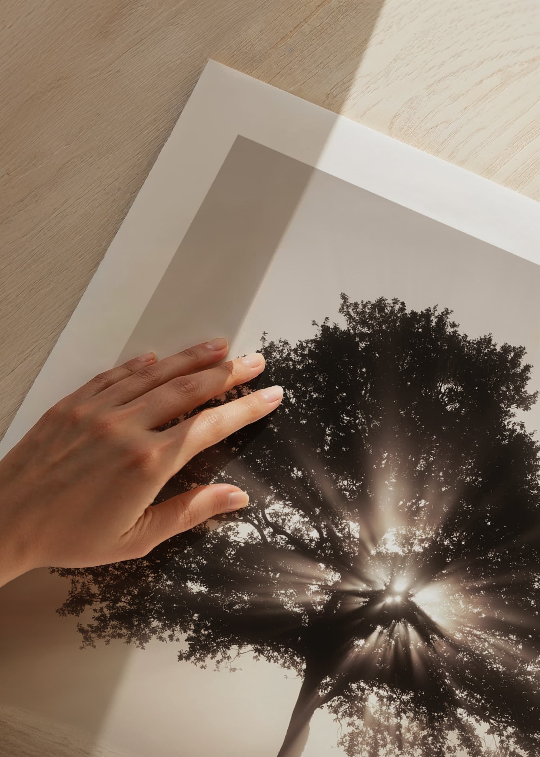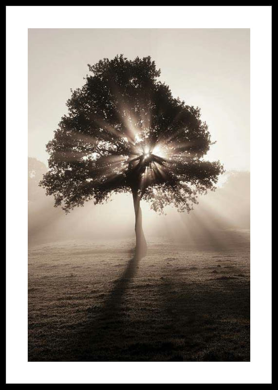 Ein einsamer Laubbaum steht auf einer offenen Wiese, getaucht in sanftes Morgenlicht. Die Sonnenstrahlen fallen durch die Äste und werfen markante Schatten auf den Boden. Gedämpfte Erdtöne und eine dunstige Atmosphäre sorgen für eine ruhige Atmosphäre. Dieses Poster bringt die Ruhe der Natur und die Kraft des Ortes in jedes Zimmer, vom Schlafzimmer bis zum Wohnzimmer.