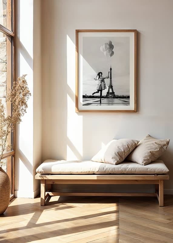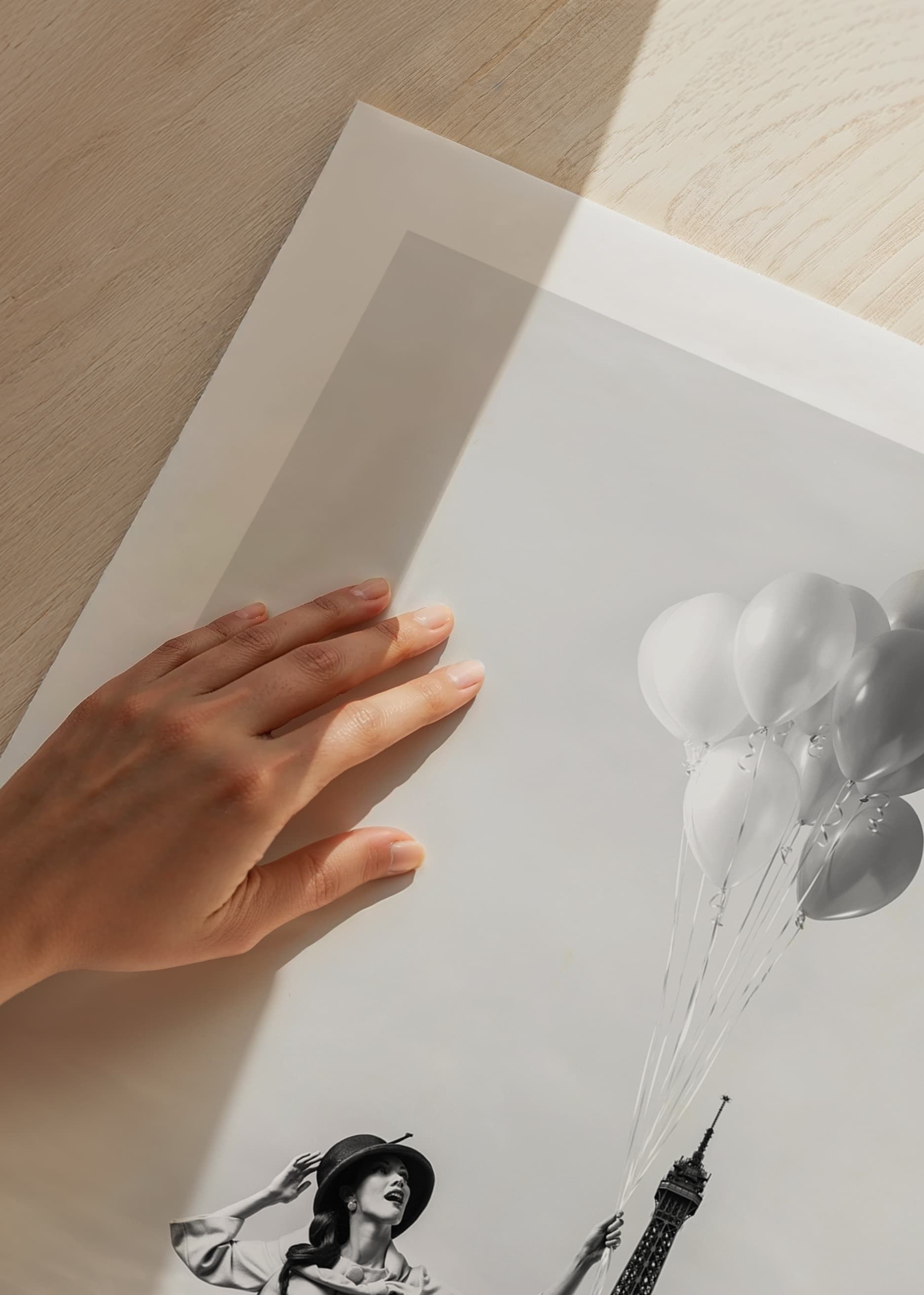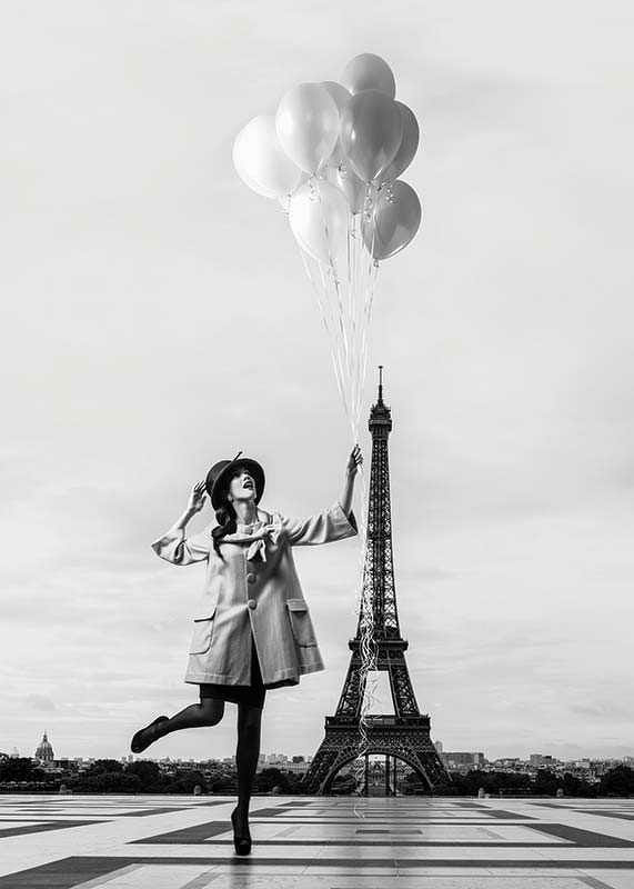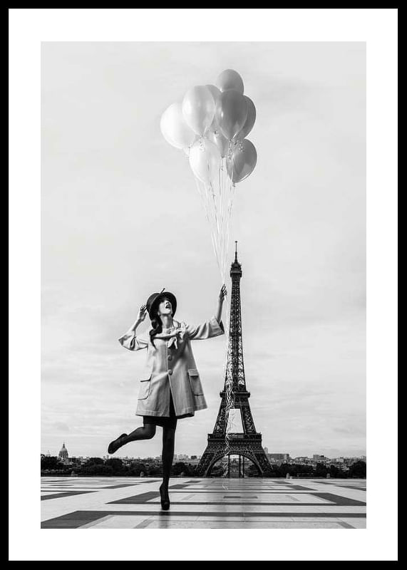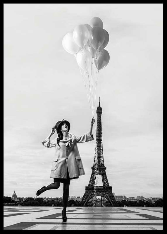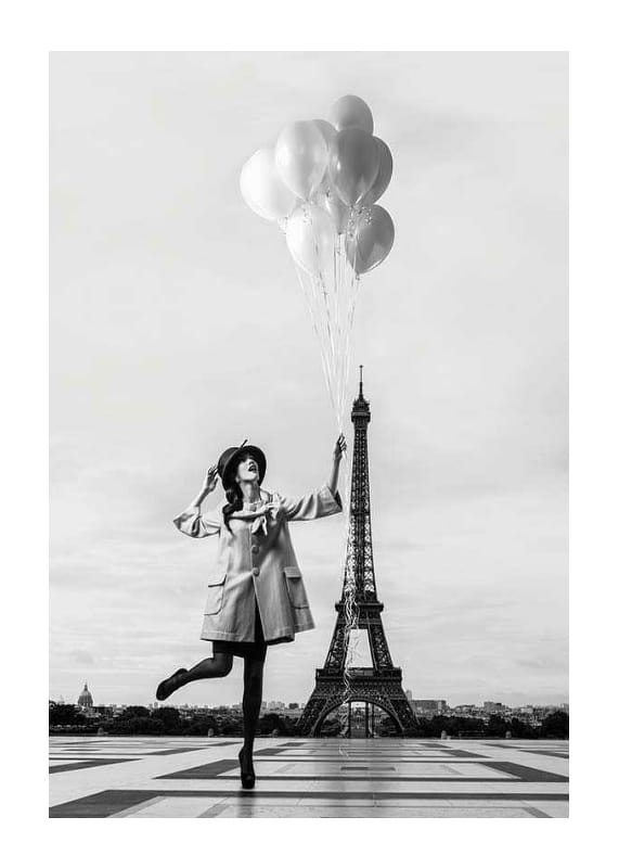 Eine junge Frau in Trenchcoat und Hut hält weiße Luftballons und posiert verspielt auf einem Platz vor dem Eiffelturm in Paris. Der Schwarz-Weiß-Stil unterstreicht den Vintage-Look und die zeitlose Eleganz des Motivs. Dieses Poster vermittelt ein stilvolles, urbanes Flair und eignet sich perfekt für Wohn- und Schlafzimmer, um einen Hauch Pariser Lebensgefühl zu vermitteln.
