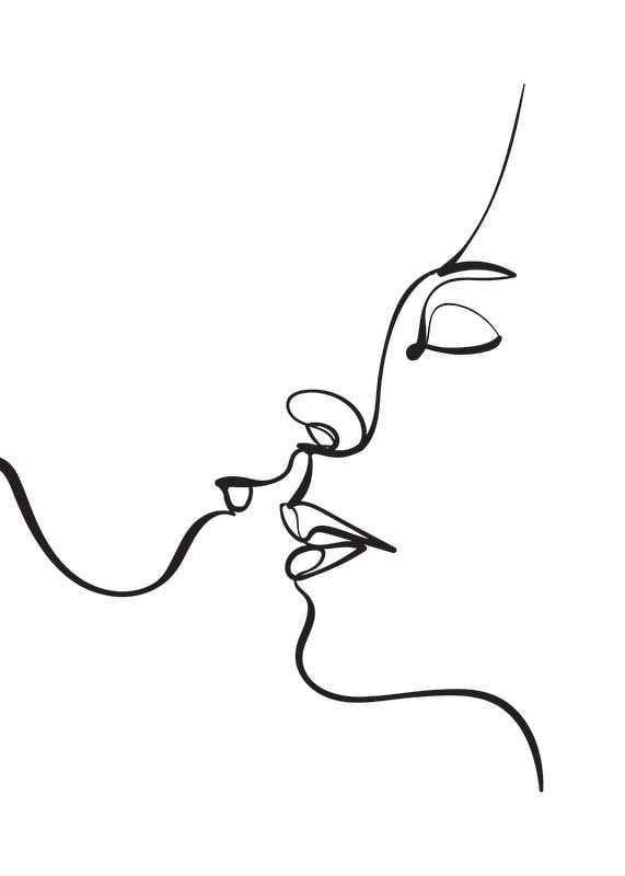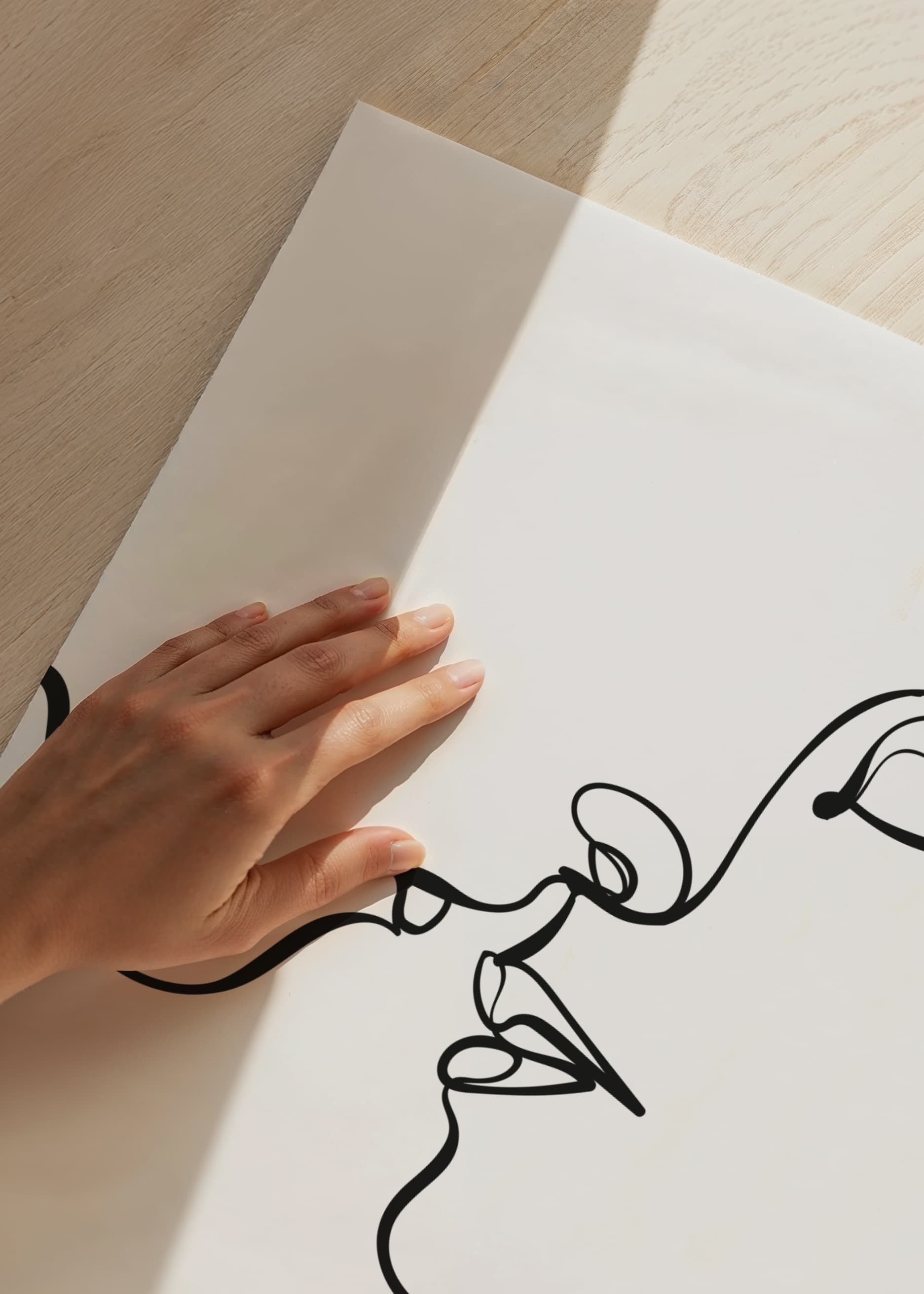 Zwei Gesichtsprofile, gezeichnet mit einer einzigen schwarzen Konturlinie auf weißem Hintergrund, treffen sich in enger und intimer Position. Das ausdrucksstarke Line-Art-Motiv wirkt stilvoll und passt gut in moderne Wohnräume. Als Poster setzt es beispielsweise im Wohn- oder Schlafzimmer ein dezentes und kunstvolles Detail.