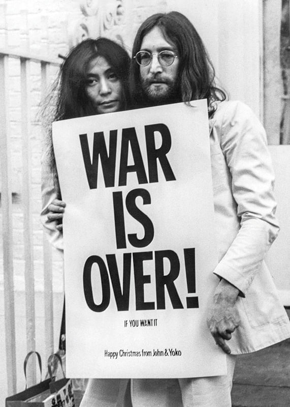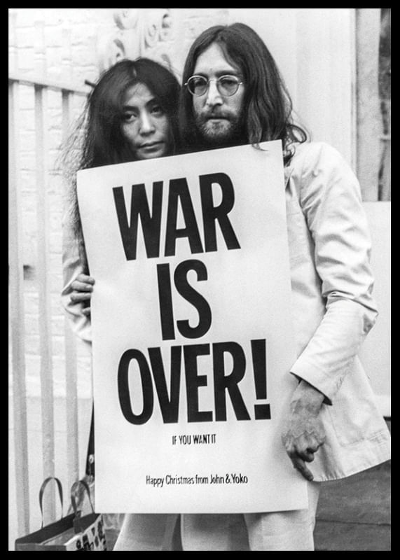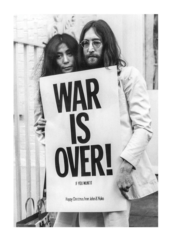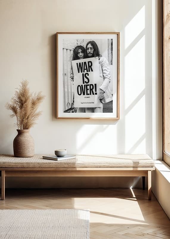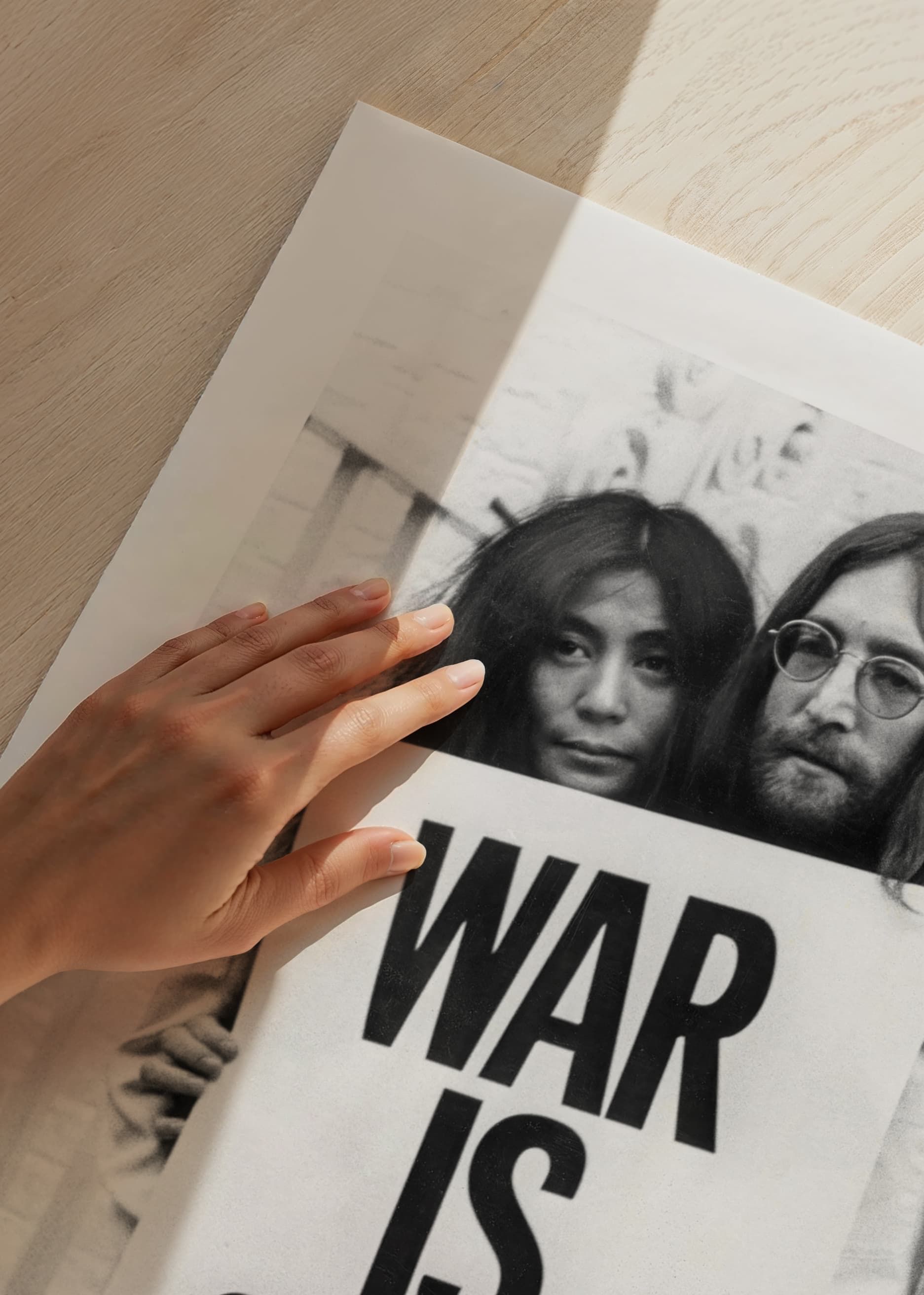 Poster aus unserer Sammlung ikonischer Fotografien mit Fotografien von John Lennon und Yoko Ono. Dieses Bild wurde von Frank Barrett im Dezember 1969 aufgenommen, als Lennon und Ono gegen den andauernden Vietnamkrieg demonstrierten. Das Plakat mit dem Text War Is Over wurde in dieser Zeit in den meisten größeren Städten verteilt und war Teil der andauernden Friedensdemonstration. Das Foto hat eine körnige Struktur, die dem Bild einen zeitgenössischen Vintage-Look verleiht.