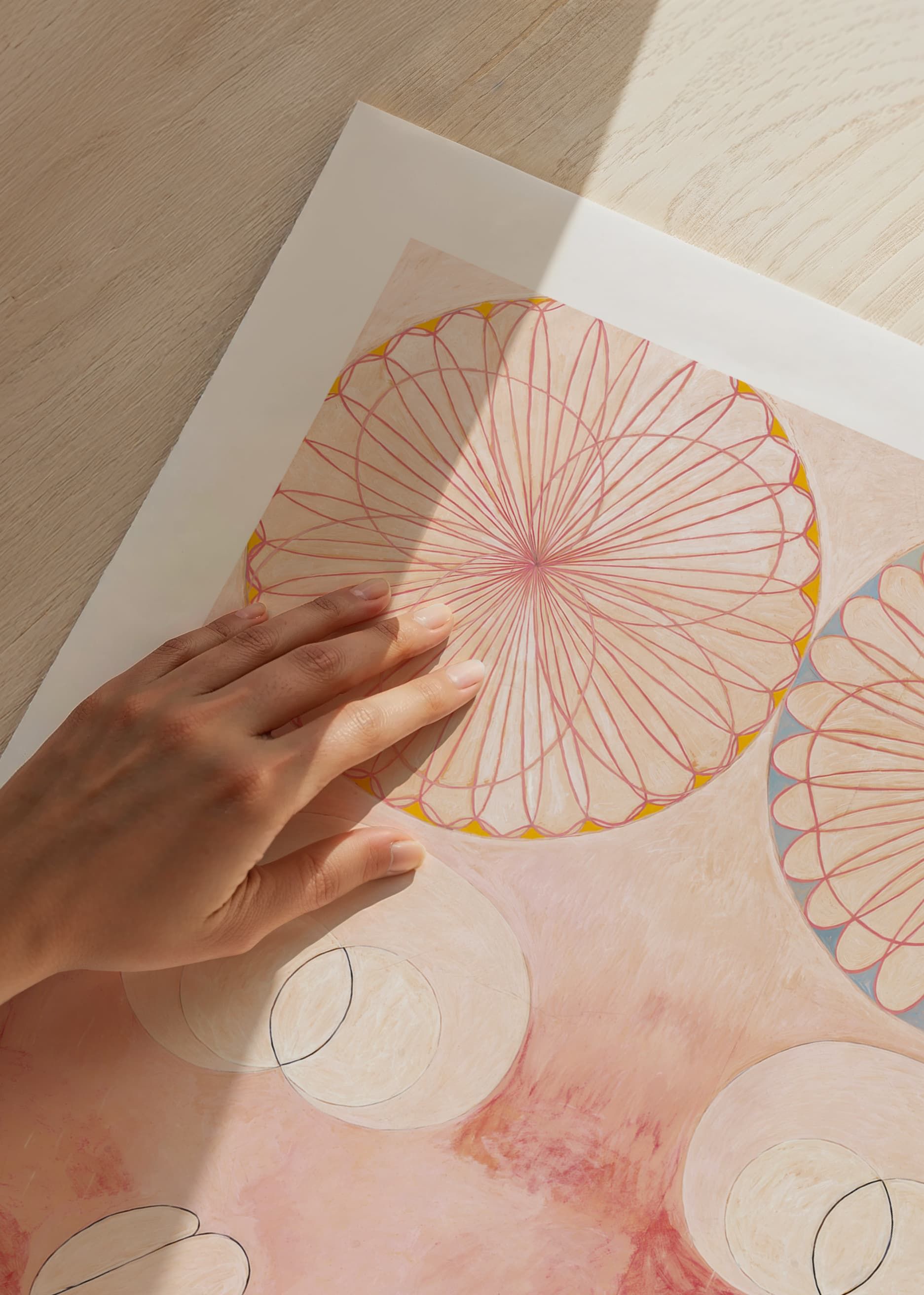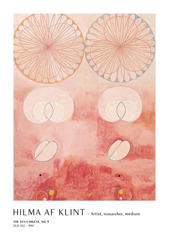 „Die zehn Größten Nr. 9“ wurde 1907 von der schwedischen Künstlerin Hilma af Klint gemalt. Das Motiv besteht aus zwei großen Kreisen mit geometrischen Mustern im oberen Bereich, gefolgt von sich überlappenden ovalen Formen und kleineren farbigen Punkten, alles auf einem Hintergrund in warmen Rosa- und Aprikosentönen. Hilma af Klints einzigartige Formensprache verleiht dem Poster eine künstlerische und poetische Note, die sich besonders für ruhige, kreative Räume eignet.