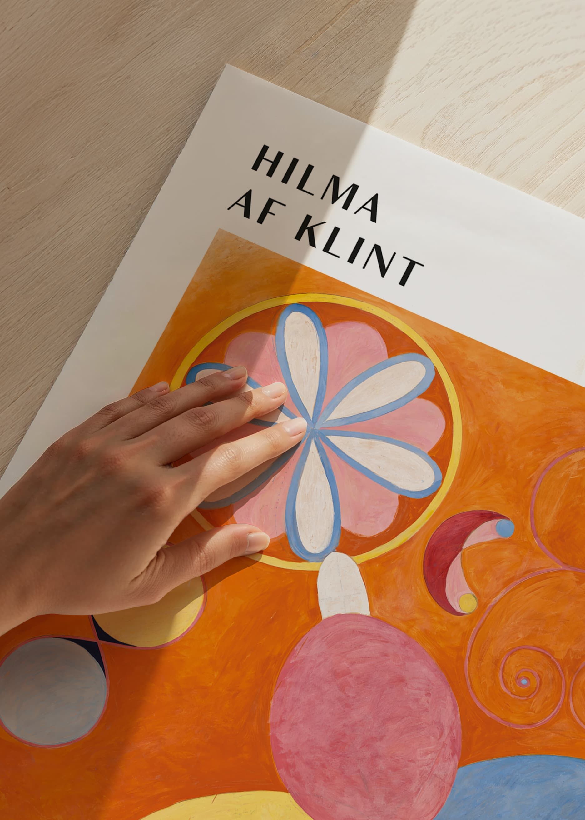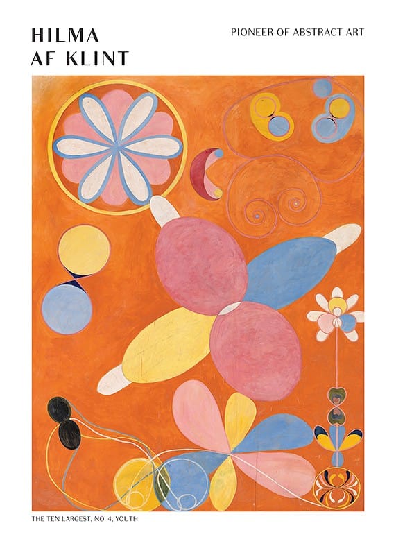 „Die zehn Größten Nr. 4“ wurde 1907 von der schwedischen Künstlerin Hilma af Klint gemalt. Große organische Formen in Blau, Rosa und Gelb breiten sich vor einem warmen orangefarbenen Hintergrund aus. Kreise, Spiralen und blumenartige Figuren verleihen Hilma af Klints einzigartigem abstrakten Stil einen dynamischen und verspielten Ausdruck. Spirituelle Symbolik durchdringt das Werk, verleiht ihm Leben und Farbe und passt sowohl in moderne Wohnzimmer als auch in kreative Arbeitsumgebungen.