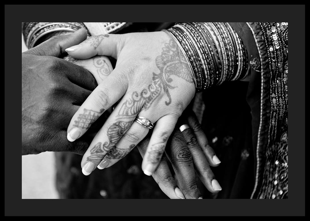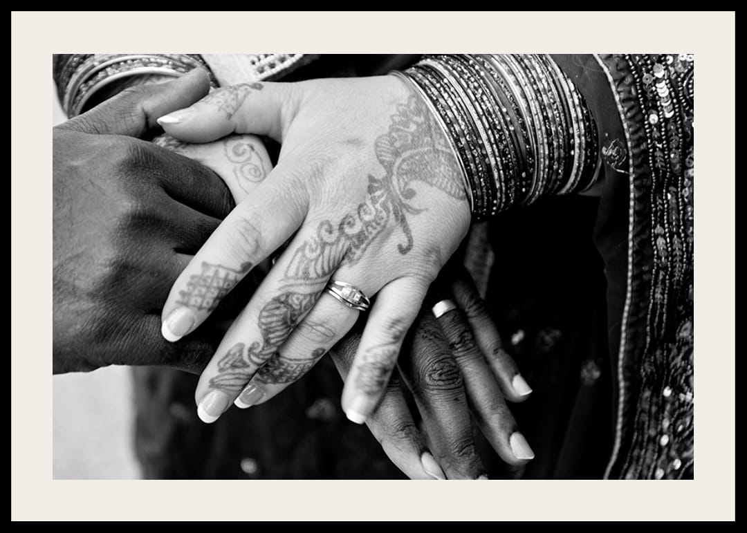 Eine detaillierte Schwarz-Weiß-Nahaufnahme von Händen mit Henna-Tattoos und Armbändern. Zwei Hände unterschiedlicher Hautfarbe treffen sich, beide mit Ringen und wunderschönen Mustern an Fingern und Handrücken. Dieses Poster fängt Intimität und Zusammengehörigkeit ein und schafft eine warme und persönliche Atmosphäre im gesamten Raum, vom Wohnzimmer bis zum Schlafzimmer.