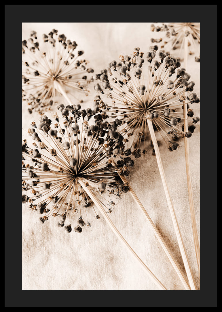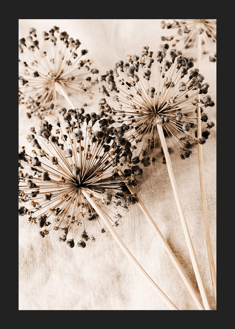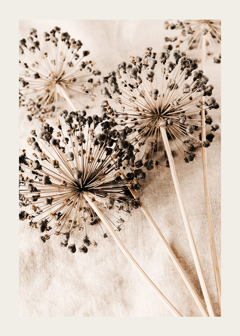 Getrocknete Alliumblüten in Kugelform verteilen sich auf einem weichen, beigen Stoff. Stiele und Blütenköpfe in gedeckten Naturtönen sorgen für ein reduziertes, modernes Flair. Dieses Poster eignet sich sowohl für Wohn- als auch für Schlafzimmer, wo sein ruhiger Ausdruck sich in ein natürlich inspiriertes Interieur einfügt.