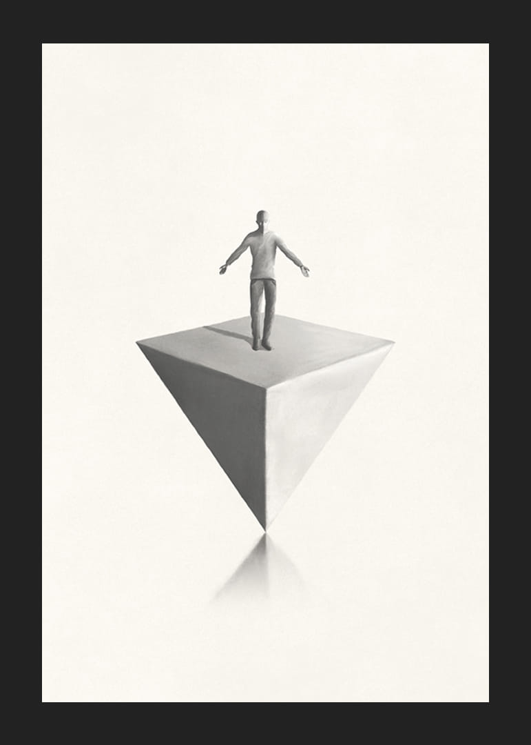 Das Motiv zeigt einen einsamen Mann mit ausgestreckten Armen auf einer umgedrehten Pyramide vor einem hellen, schlichten Hintergrund. Die sanften Graustufen verleihen dem Bild eine konzeptuelle Note und betonen die Ausgewogenheit der Komposition. Dieses Poster passt sowohl in moderne als auch in minimalistische Innenräume.