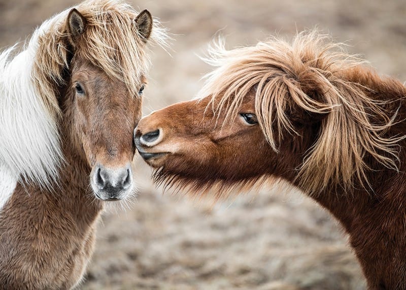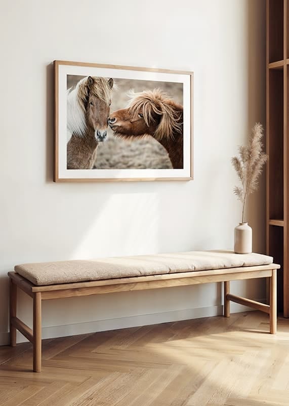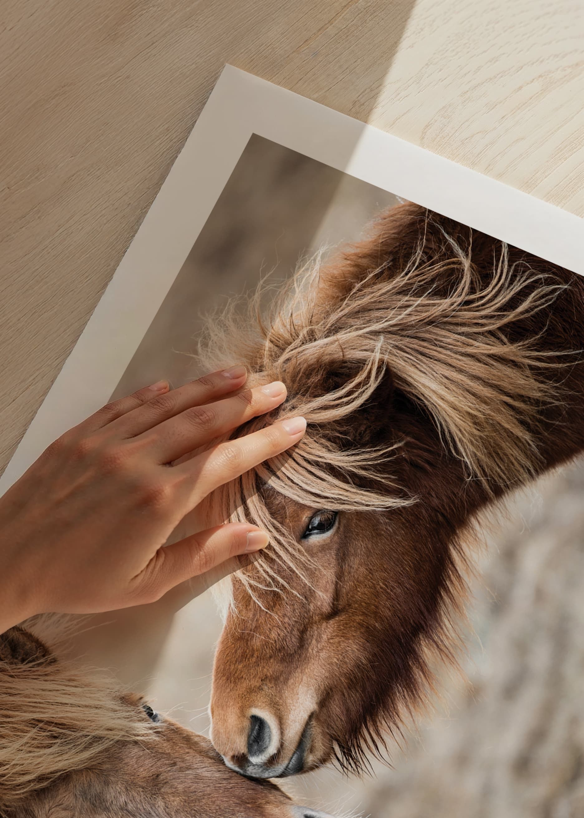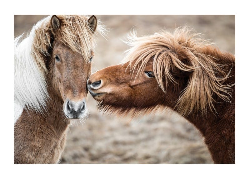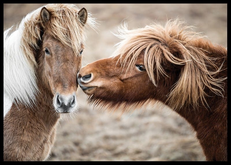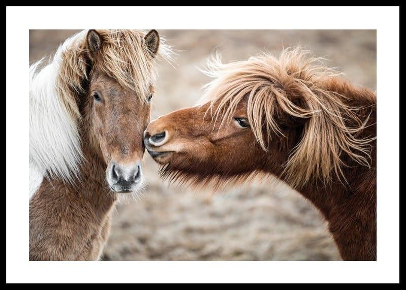 Zwei braune Ponys mit langen, struppigen Mähnen stehen dicht beieinander vor einem sanft verschwommenen Hintergrund in der Natur. Ein Pferd hat weiße Flecken im Fell und die verschmitzten Mähnen verleihen dem Motiv eine verspielte Note. Dieses Poster passt gut in ein Kinder- oder Spielzimmer und verleiht dem Interieur eine warme, freundliche Atmosphäre.