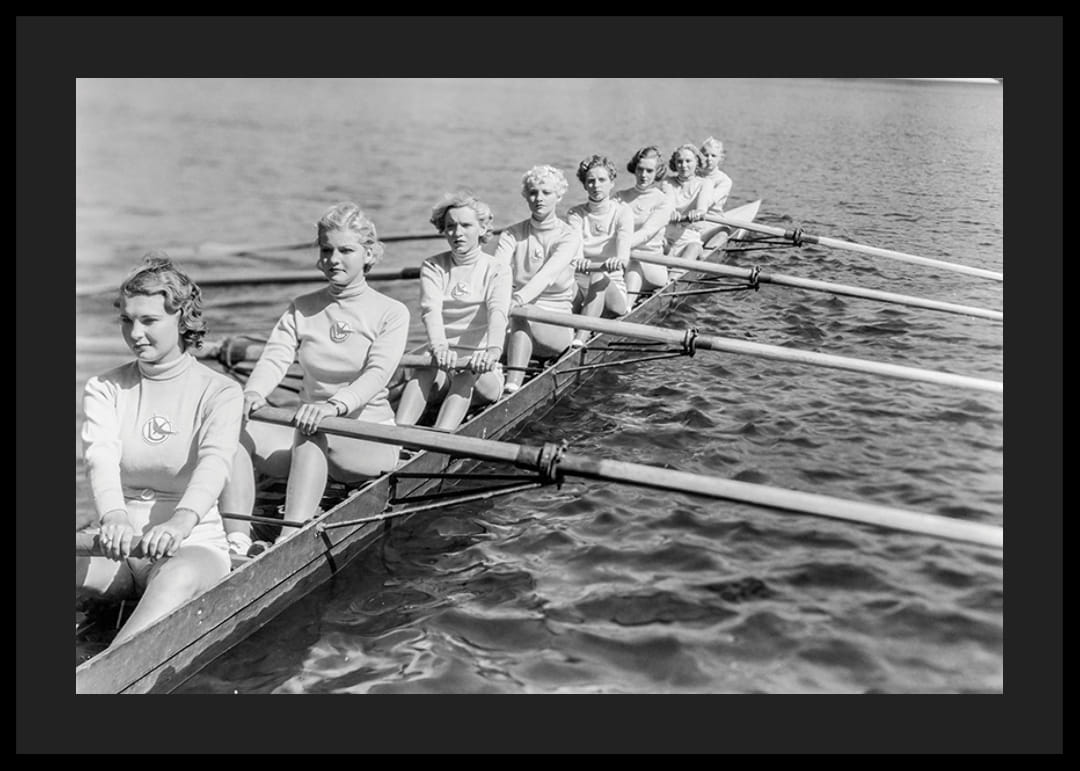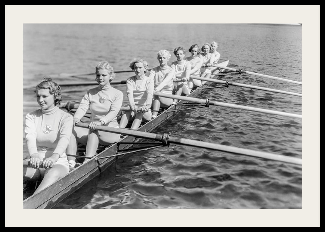 Acht Frauen sitzen in einer Reihe in einem langen Ruderboot und rudern im Gleichklang. Sie tragen passende Trikots mit Emblemen. Die Wellen plätschern um die Ruder, im Hintergrund zeichnet sich der Horizont ab. Dieses schwarz-weiße Poster vermittelt ein Vintage-Gefühl und eignet sich für Wohnungen, in denen Geschichte und Gemeinschaft gleichermaßen geschätzt werden.