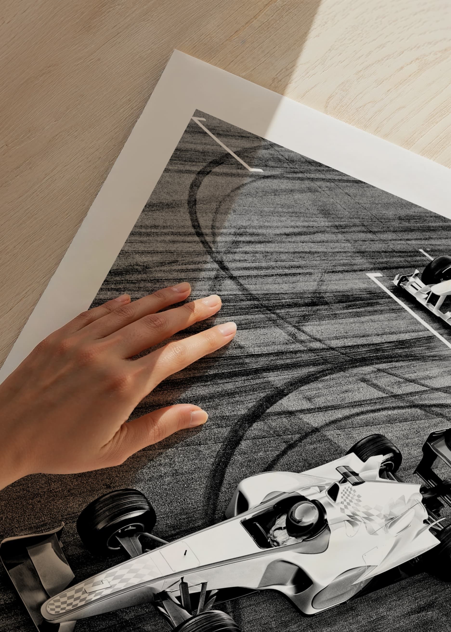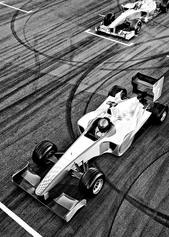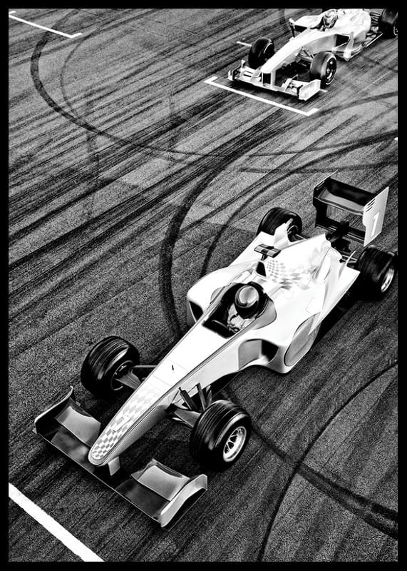 Zwei Formel-Rennwagen sind in Schwarzweiß von oben abgebildet, wobei deutliche Reifenspuren Muster auf der Rennstreckenoberfläche bilden. Das Auto mit der Startnummer 1 ist im Fokus und steht bereit an der Startlinie. Der grafische Kontrast zwischen Fahrzeug und Oberfläche verleiht dem Poster einen dynamischen Ausdruck und macht es zu einem spannenden Blickfang in sportbegeisterten Umgebungen.