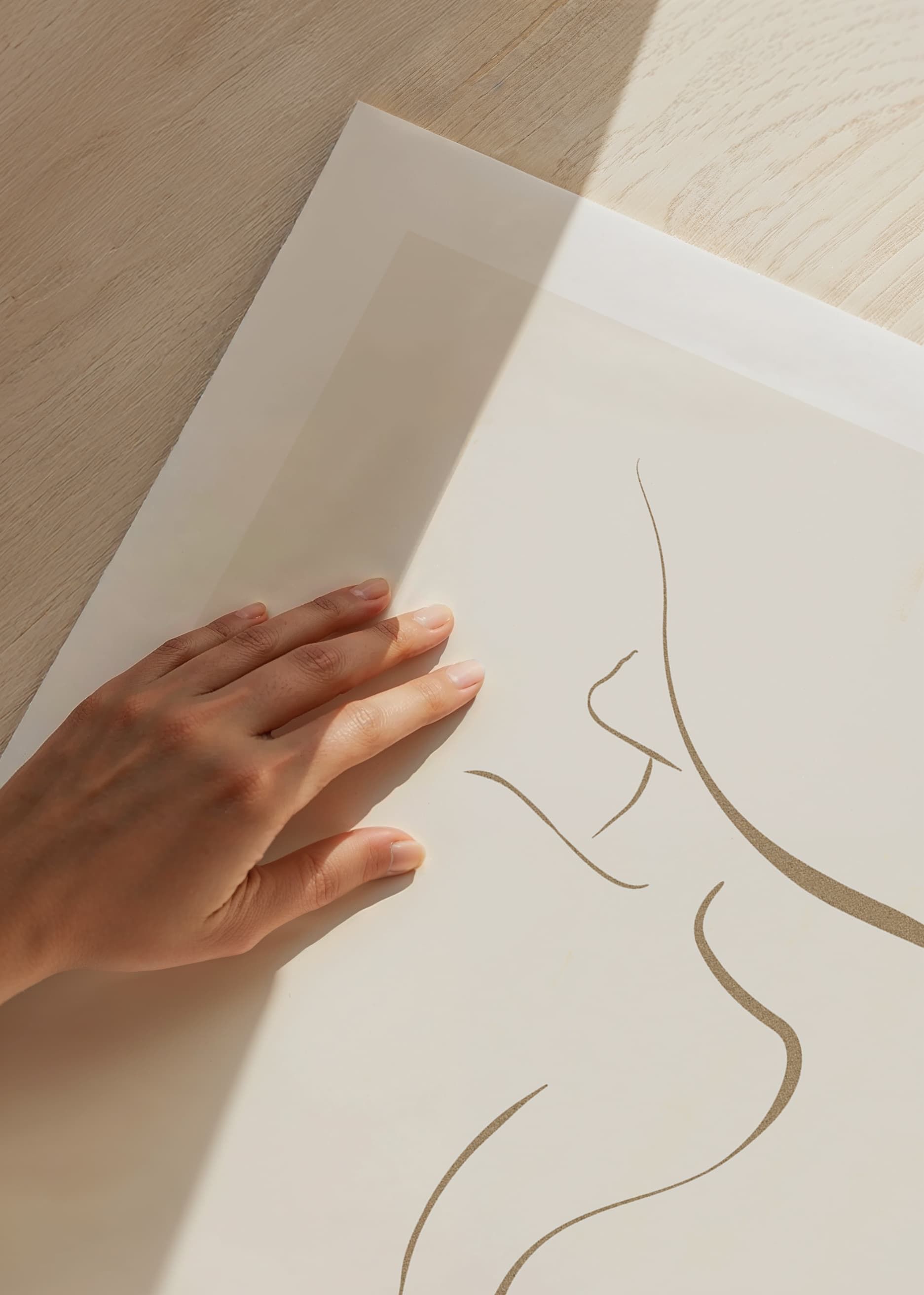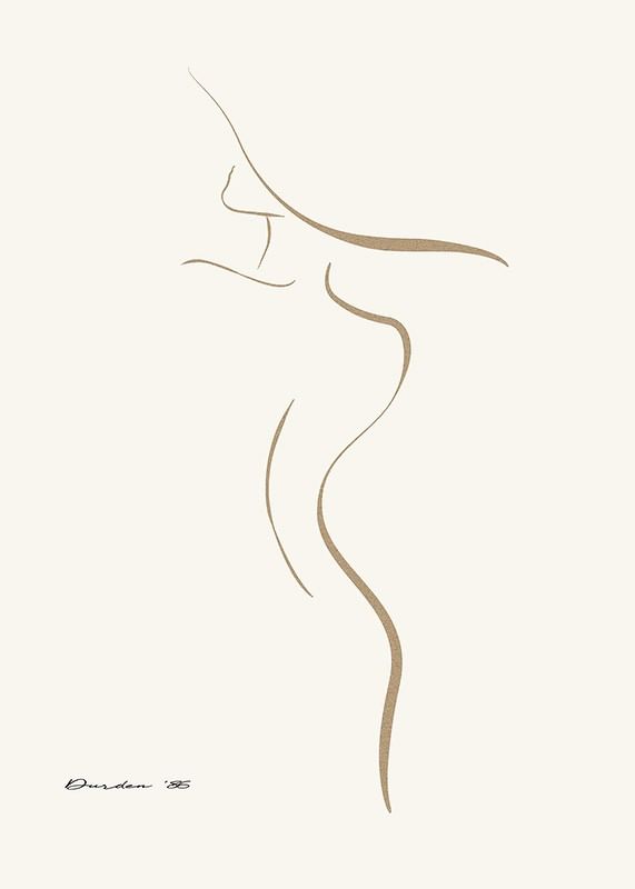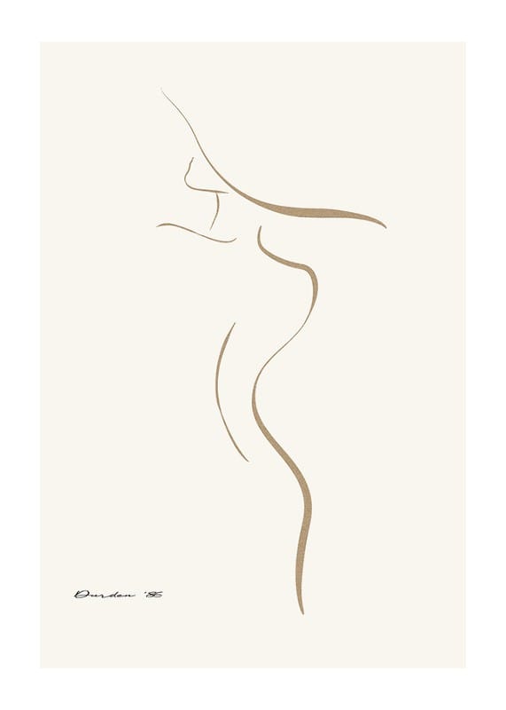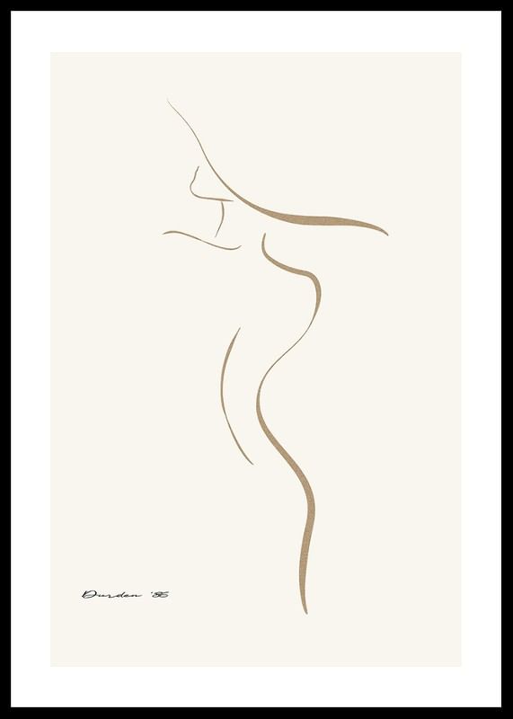 Weiche, geschwungene Linien bilden die stilisierte Silhouette eines weiblichen Körpers vor einem hellbeigen Hintergrund. Die minimalistische Komposition und die warmen, neutralen Farben erzeugen einen subtilen und modernen Ausdruck. Das Poster passt gut in Räume, in denen eine ruhige und schlichte Ästhetik gewünscht ist, wie zum Beispiel Schlafzimmer oder Wohnzimmer.