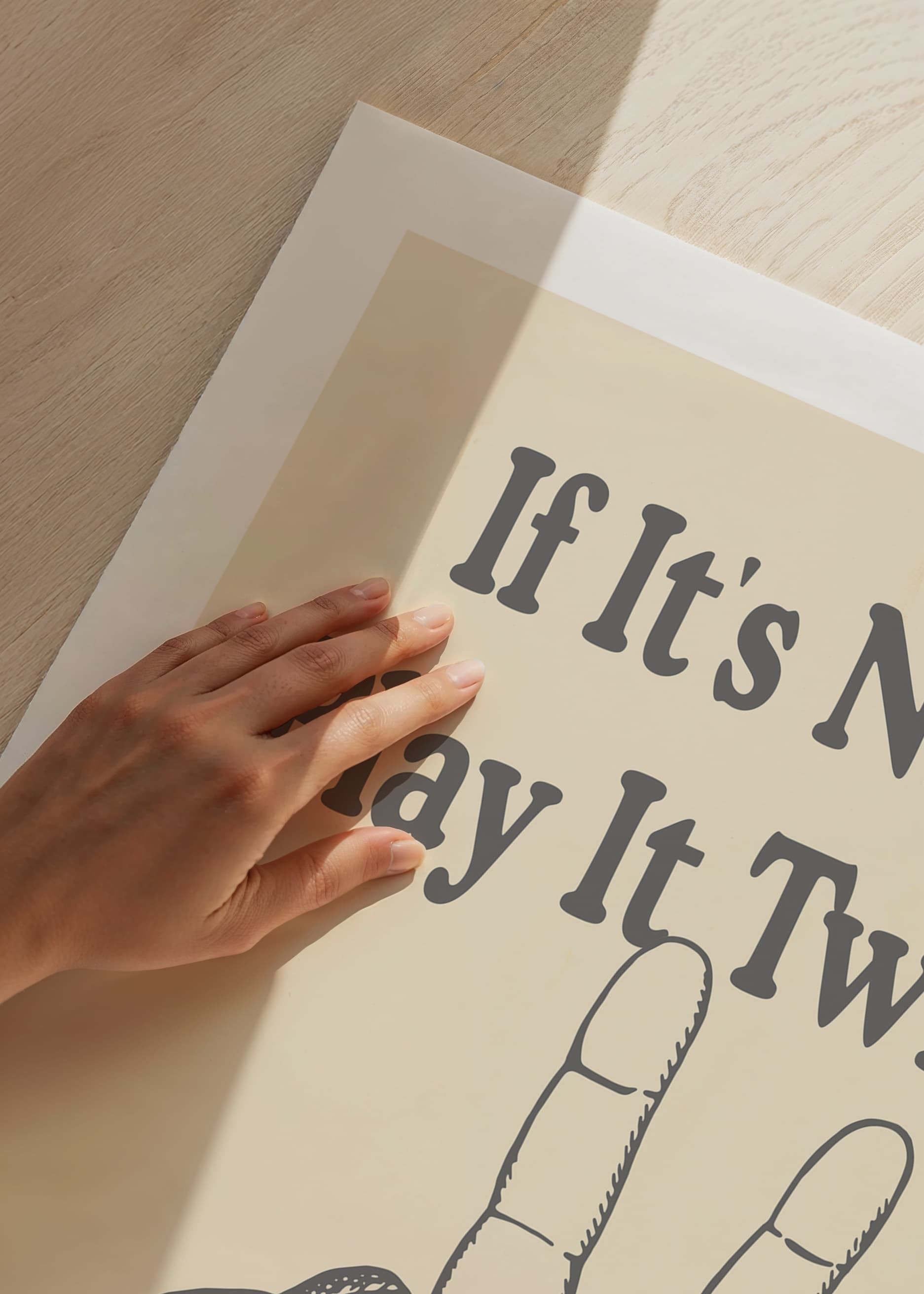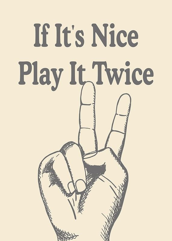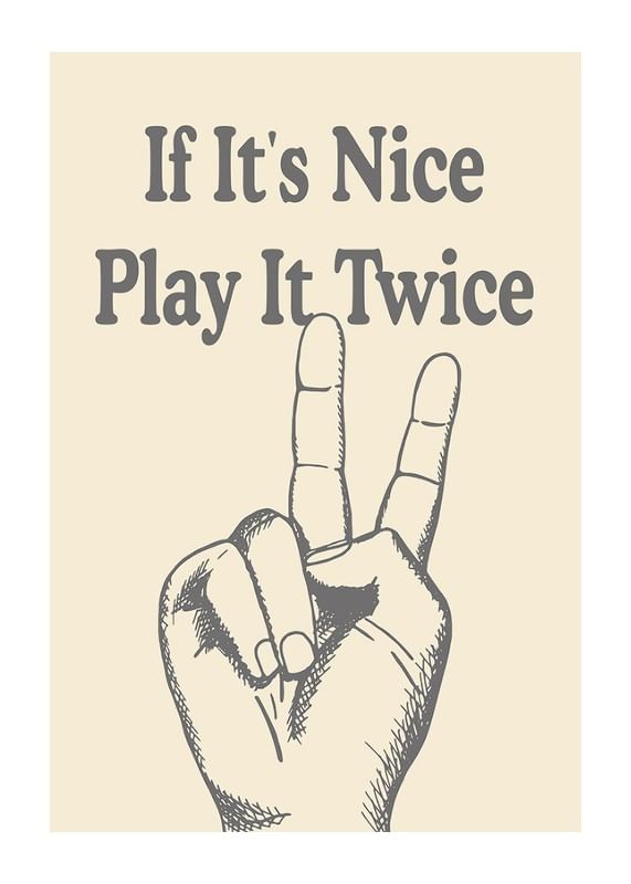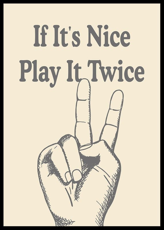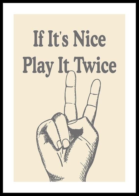 Die Handzeichnung in schwarzen und grauen Linien zeigt ein V-Zeichen vor hellbeigem Hintergrund. Über der Hand steht in großen Buchstaben der englische Text „If It's Nice Play It Twice“. Die Kombination aus witzigem Text und grafischem Stil macht das Poster zu einem verspielten Element in Musikzimmern, Wohnzimmern oder sozialen Umgebungen.
