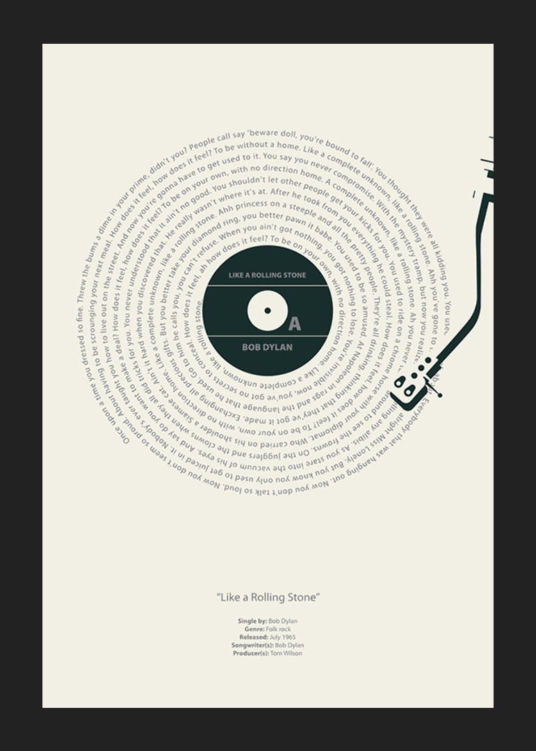 Das Motiv besteht aus einer stilisierten Schallplatte, auf der der Text von Bob Dylans Song „Like a Rolling Stone“ in konzentrischen Kreisen wie Rillen auf einer Schallplatte angeordnet ist. Rechts ist vor hellem Hintergrund ein minimalistisches Tonarmelement zu sehen. Dieses Poster eignet sich perfekt für Musikzimmer, Wohnzimmer oder Büros, in denen Design und Musik gleichermaßen geschätzt werden.