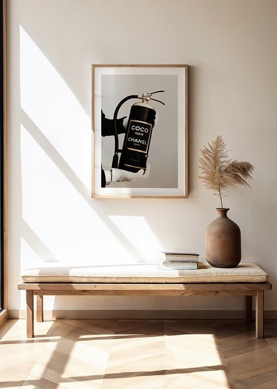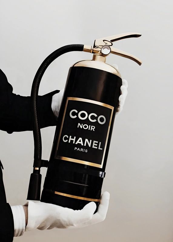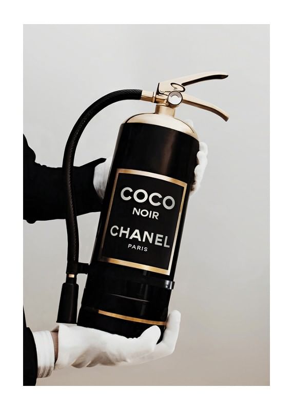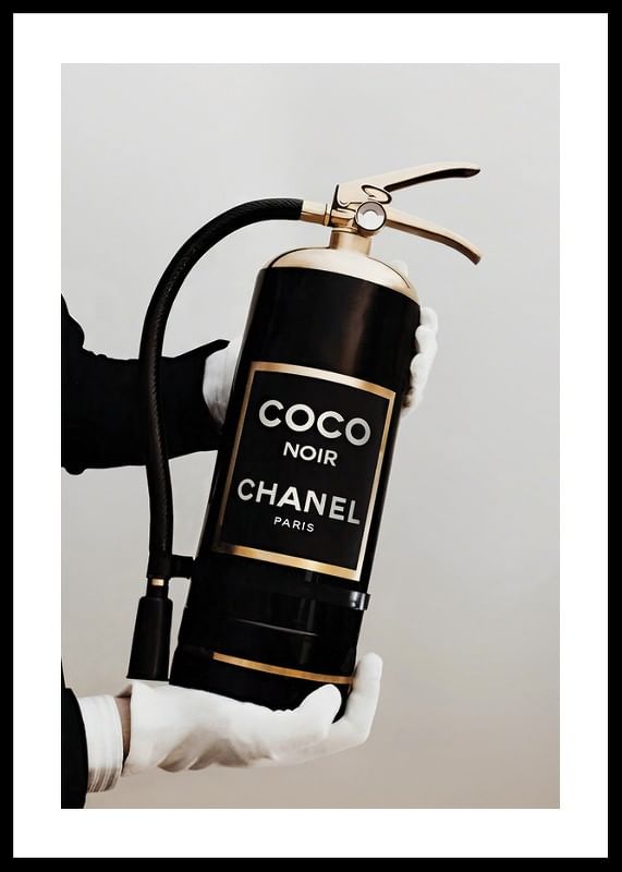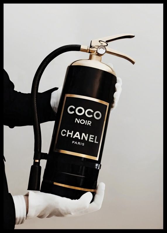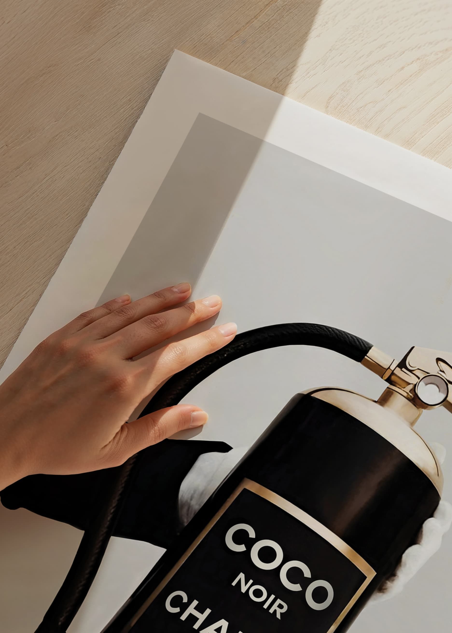 Ein schwarzer Feuerlöscher mit goldenen Details und einem klaren Etikett mit der Aufschrift „Coco Noir Chanel Paris“ wird von weiß behandschuhten Händen vor einem hellen Hintergrund gehalten. Dieses Poster kombiniert Modeikonografie mit Alltagsgegenständen und passt in moderne Umgebungen, in denen Stil auf Humor trifft.