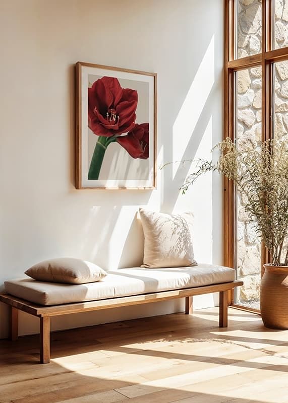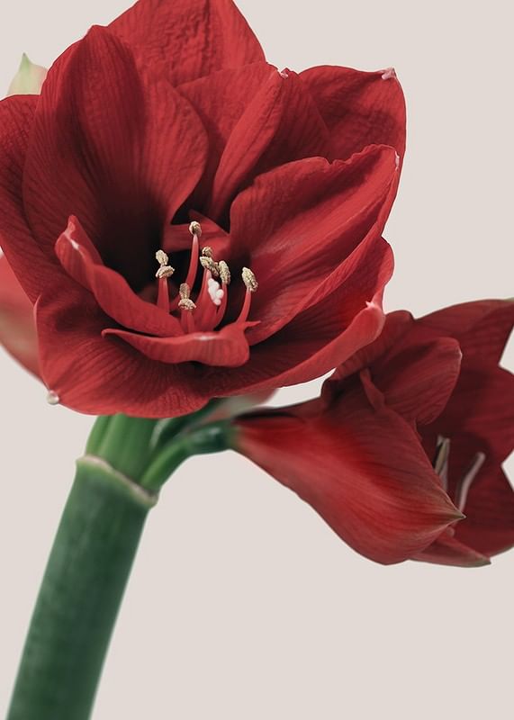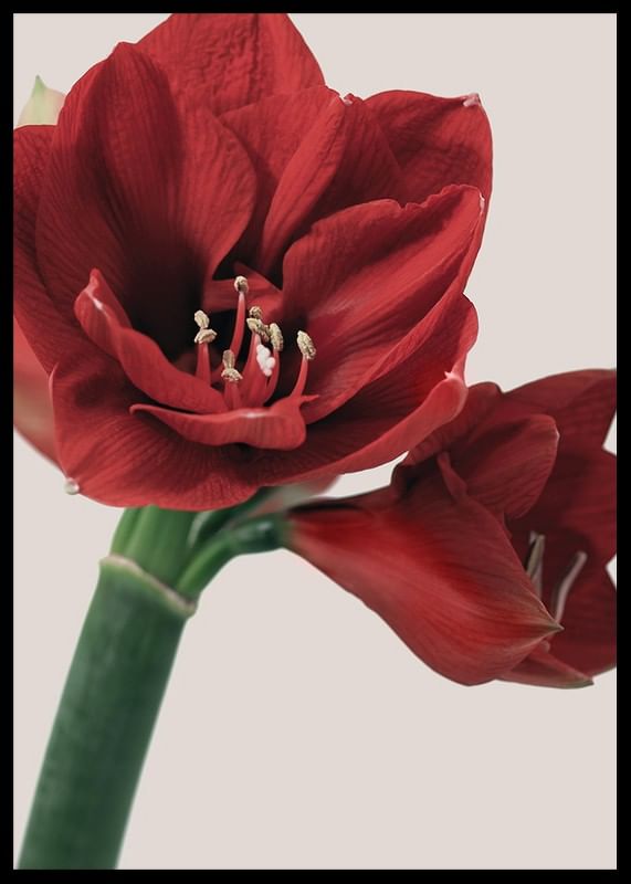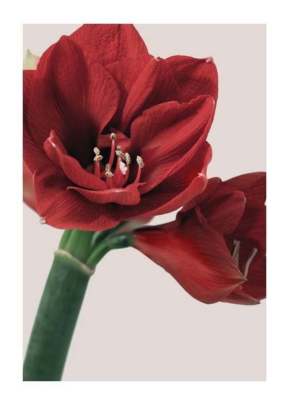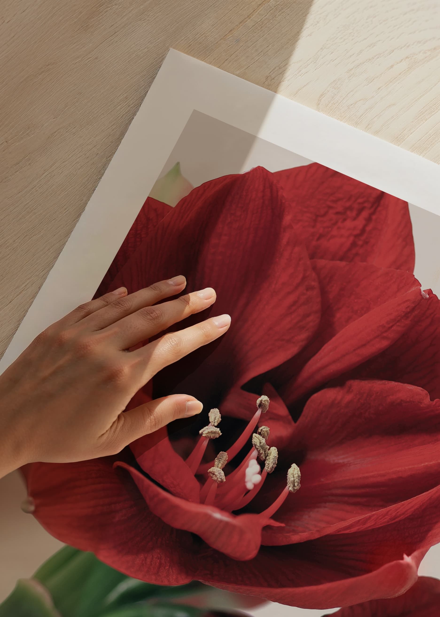 Nahaufnahme einer roten Amaryllis mit klaren Blattadern und sichtbaren Staubgefäßen. Die tiefroten Töne der Blüte heben sich vom hellen, einfarbigen Hintergrund ab und erzeugen ein klares und stilvolles Ambiente. Mit seinem dezenten Ausdruck passt dieses Poster in ein Wohnzimmer oder einen Flur, wo natürliche Details und Farbtupfer den Raum zum Leben erwecken.