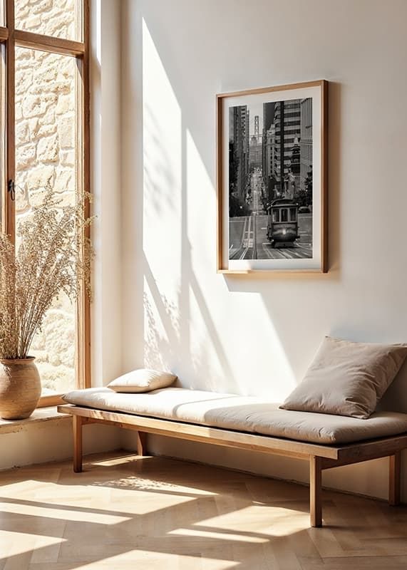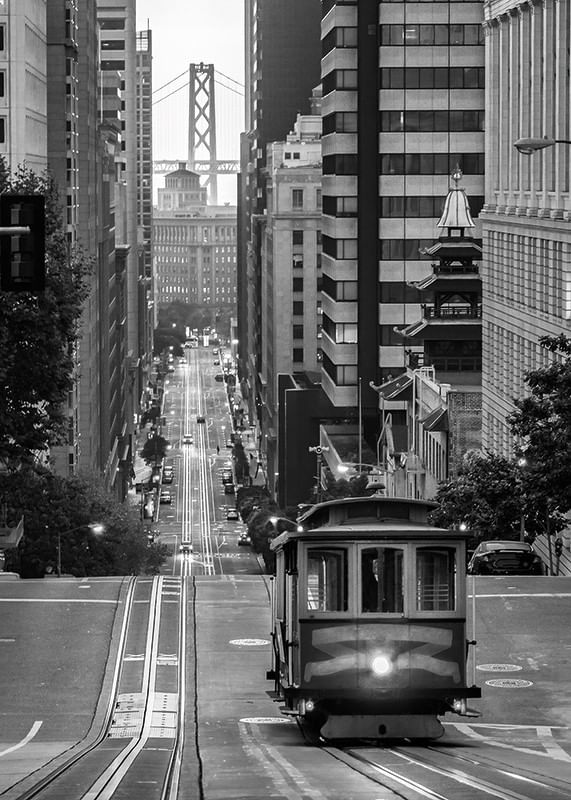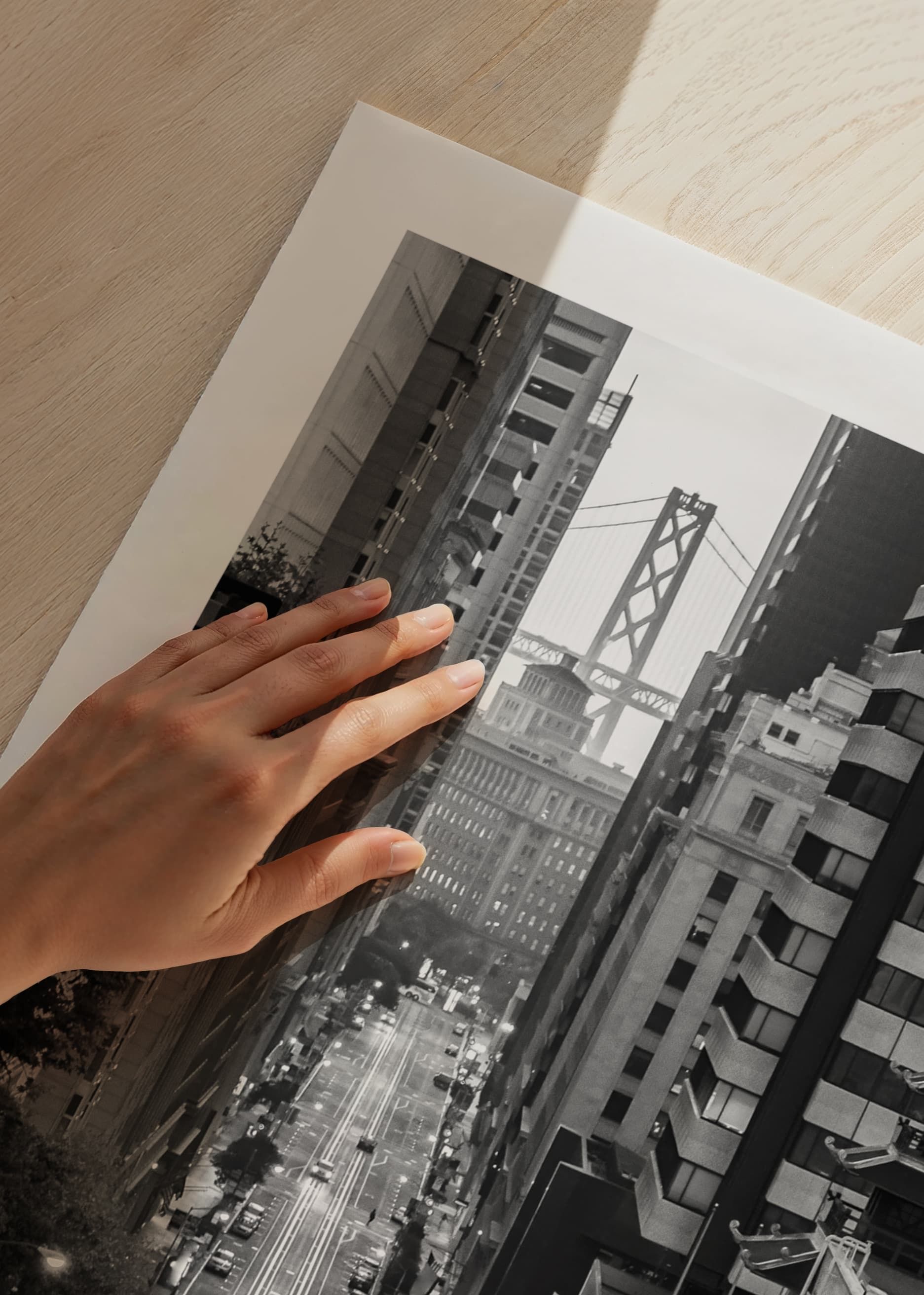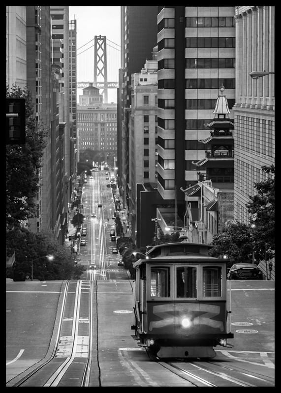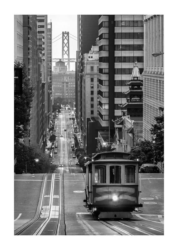 Eine charakteristische Straßenbahn rollt eine steile Straße in der Innenstadt von San Francisco hinauf, umgeben von hohen Gebäuden, die gerade Linien bilden. Im Hintergrund ist die ikonische Bay Bridge zu sehen, die dem Motiv ein ausgeprägtes urbanes Flair verleiht. Die schwarz-weiße Farbgebung macht dieses Poster zeitlos und stilvoll – perfekt für urbane Dekorationen.
