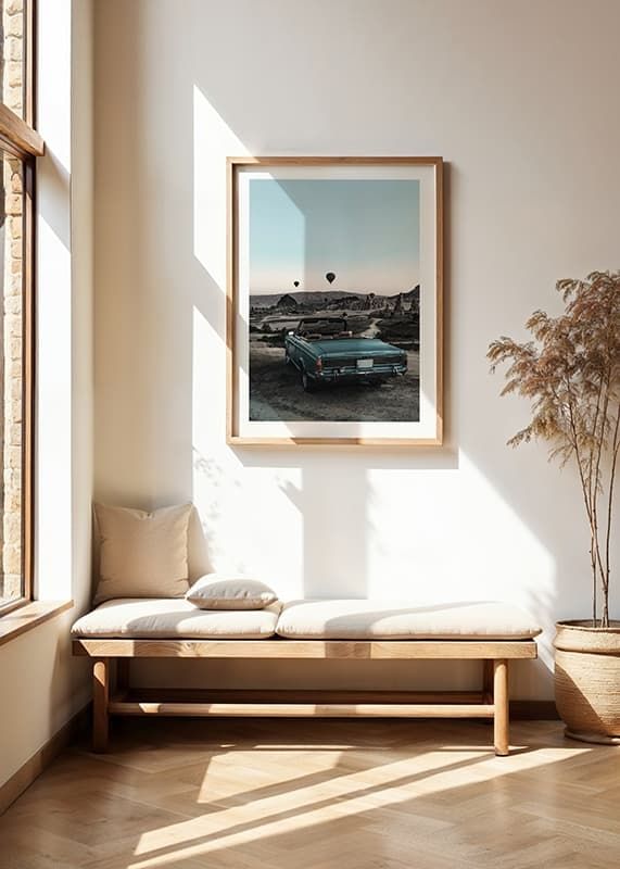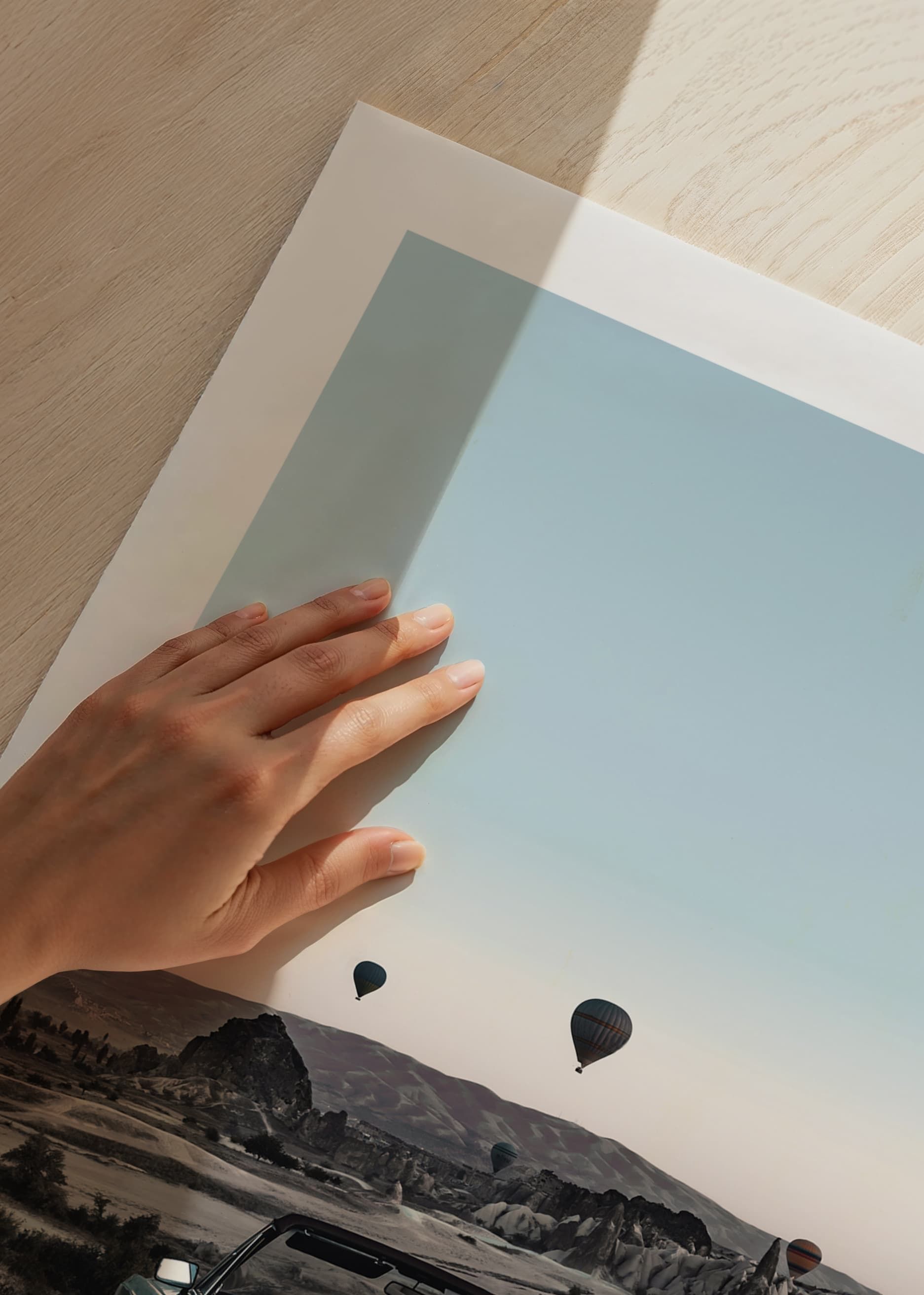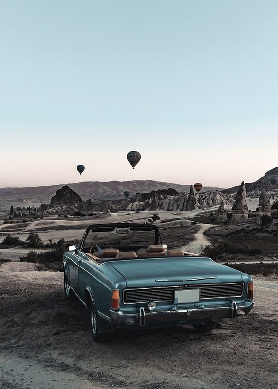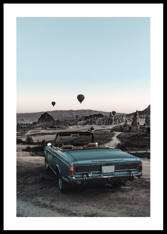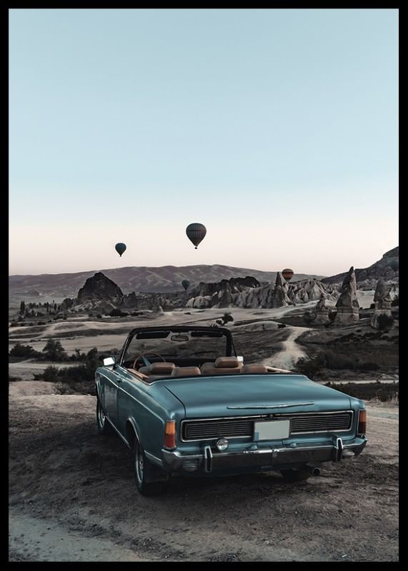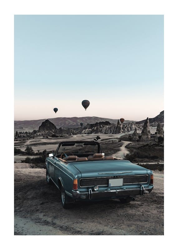 Von hinten ist ein hellblauer Oldtimer mit offenem Verdeck zu sehen, der auf einem Hügel mit Blick auf eine sanfte Berglandschaft parkt. Mehrere bunte Heißluftballons schweben über dem Horizont vor einem klaren Himmel. Dieses Poster verbindet Freiheitsgefühl mit Vintage-Ästhetik und eignet sich für alles vom Wohnzimmer bis zum Flur.