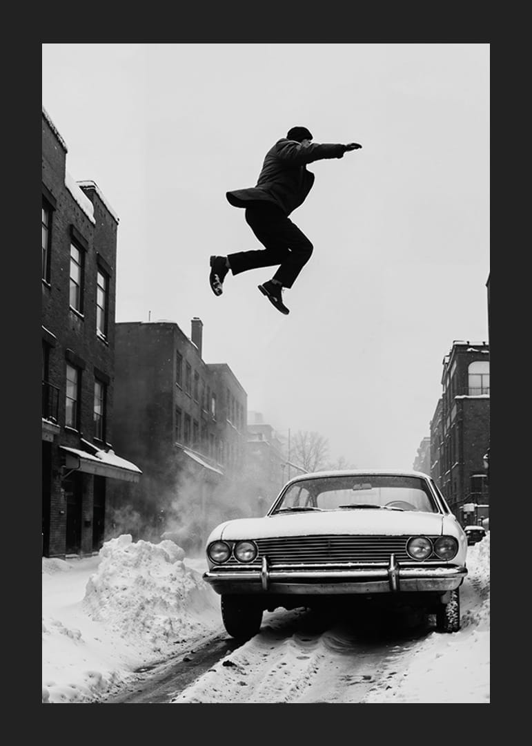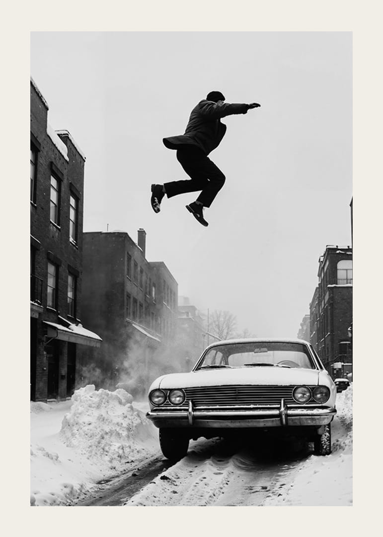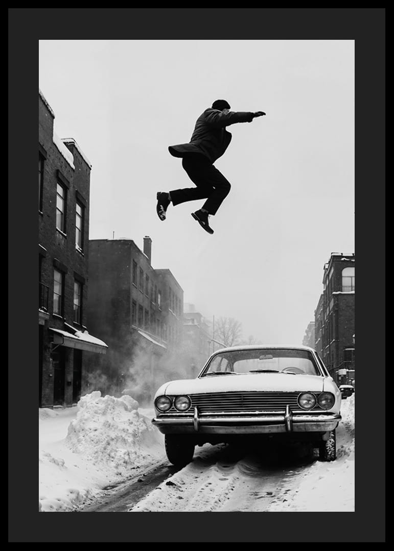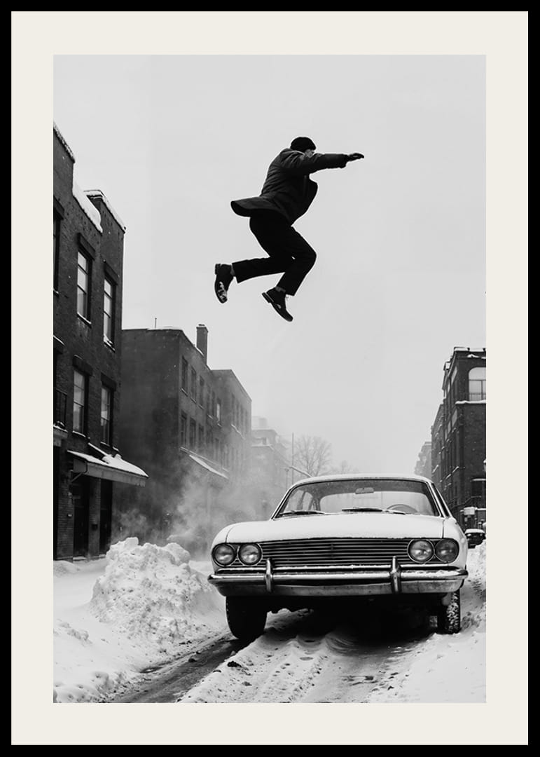 Eine winterlich bewachsene Stadtstraße mit Schneehaufen und klassischen Backsteinhäusern ist von einem dramatischen Moment umgeben, in dem ein Mann, bekleidet mit Jacke und Hose, über die Motorhaube eines alten, schneebedeckten Oldtimers springt. Der Schwarz-Weiß-Stil und die Energie des Motivs verleihen diesem Poster einen urbanen Ausdruck, der perfekt in moderne Wohnzimmer oder Büros passt.