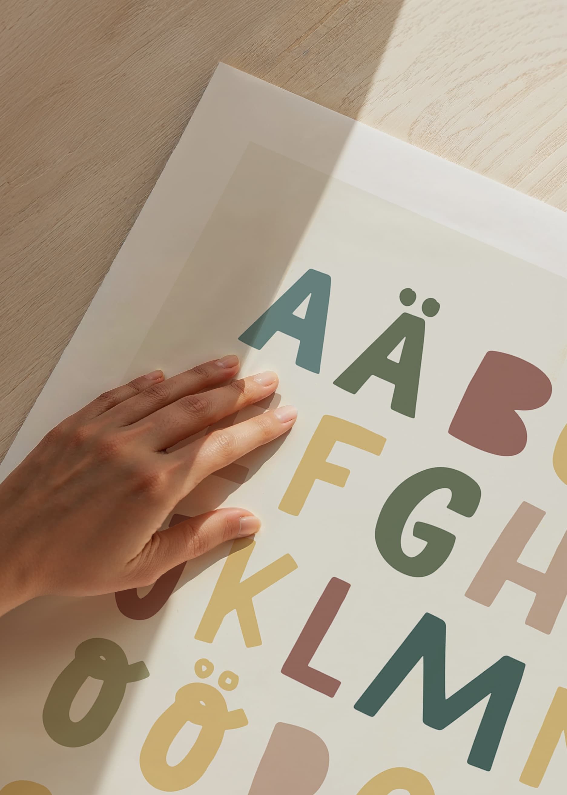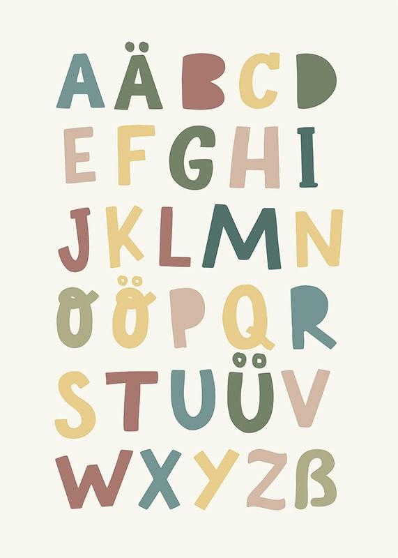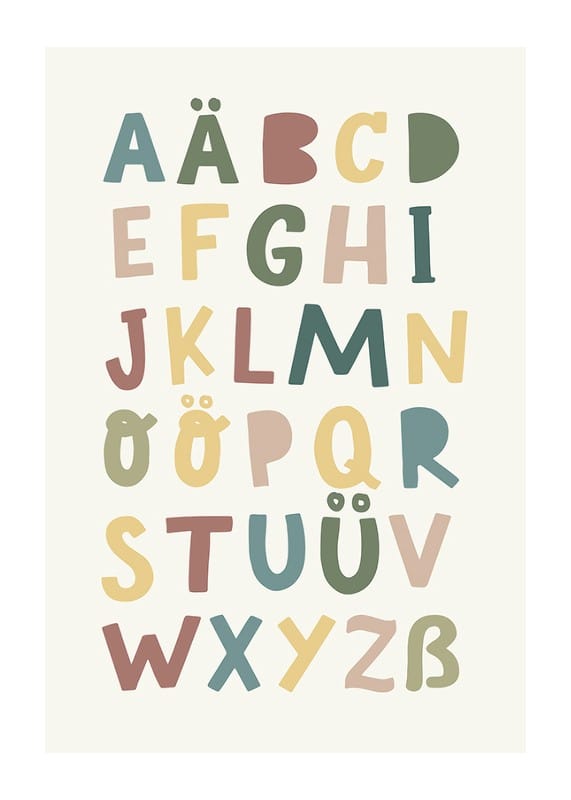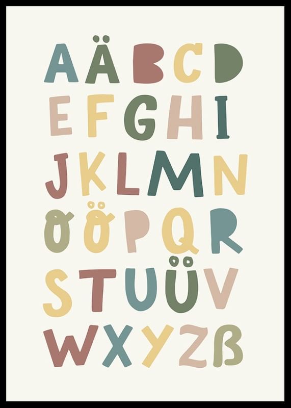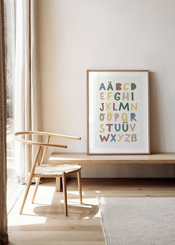 Verwandeln Sie das Kinderzimmer mit diesem farbenfrohen und lehrreichen Poster. Das verspielte Design mit dem Alphabet in sanften, gedeckten Farbtönen macht das Lernen unterhaltsam und optisch ansprechend. Perfekt, um bei Ihrem Kind jeden Tag Neugier und Kreativität zu wecken.