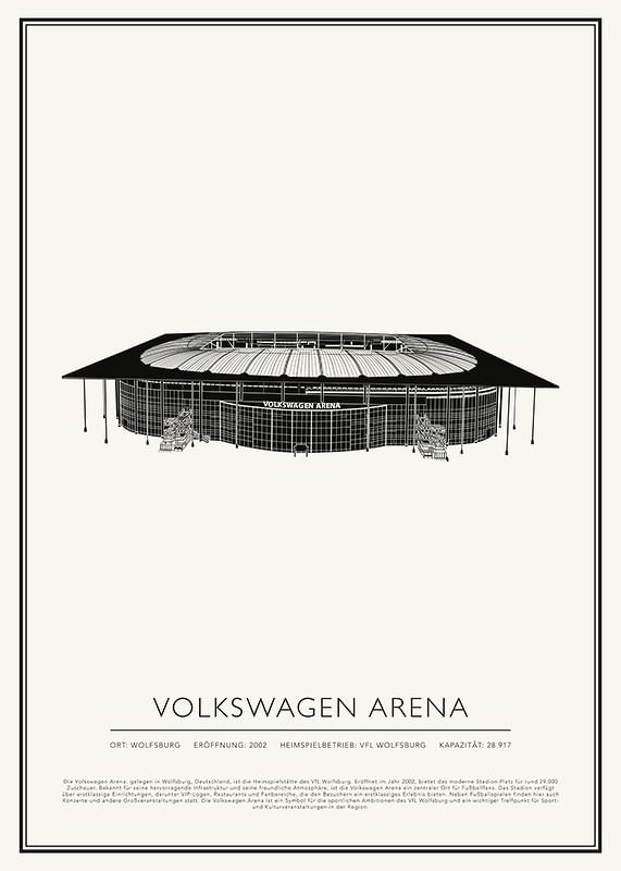 Die Volkswagen Arena, gelegen in Wolfsburg, Deutschland, ist die Heimspielstätte des VfL Wolfsburg. Eröffnet im Jahr 2002, bietet das moderne Stadion Platz für rund 29.000 Zuschauer. Bekannt für seine hervorragende Infrastruktur und seine freundliche Atmosphäre, ist die Volkswagen Arena ein zentraler Ort für Fußballfans. Das Stadion verfügt über erstklassige Einrichtungen, darunter VIP-Logen, Restaurants und Fanbereiche, die den Besuchern ein erstklassiges Erlebnis bieten. Neben Fußballspielen finden hier auch Konzerte und andere Großveranstaltungen statt. Die Volkswagen Arena ist ein Symbol für die sportlichen Ambitionen des VfL Wolfsburg und ein wichtiger Treffpunkt für Sport- und Kulturveranstaltungen in der Region.