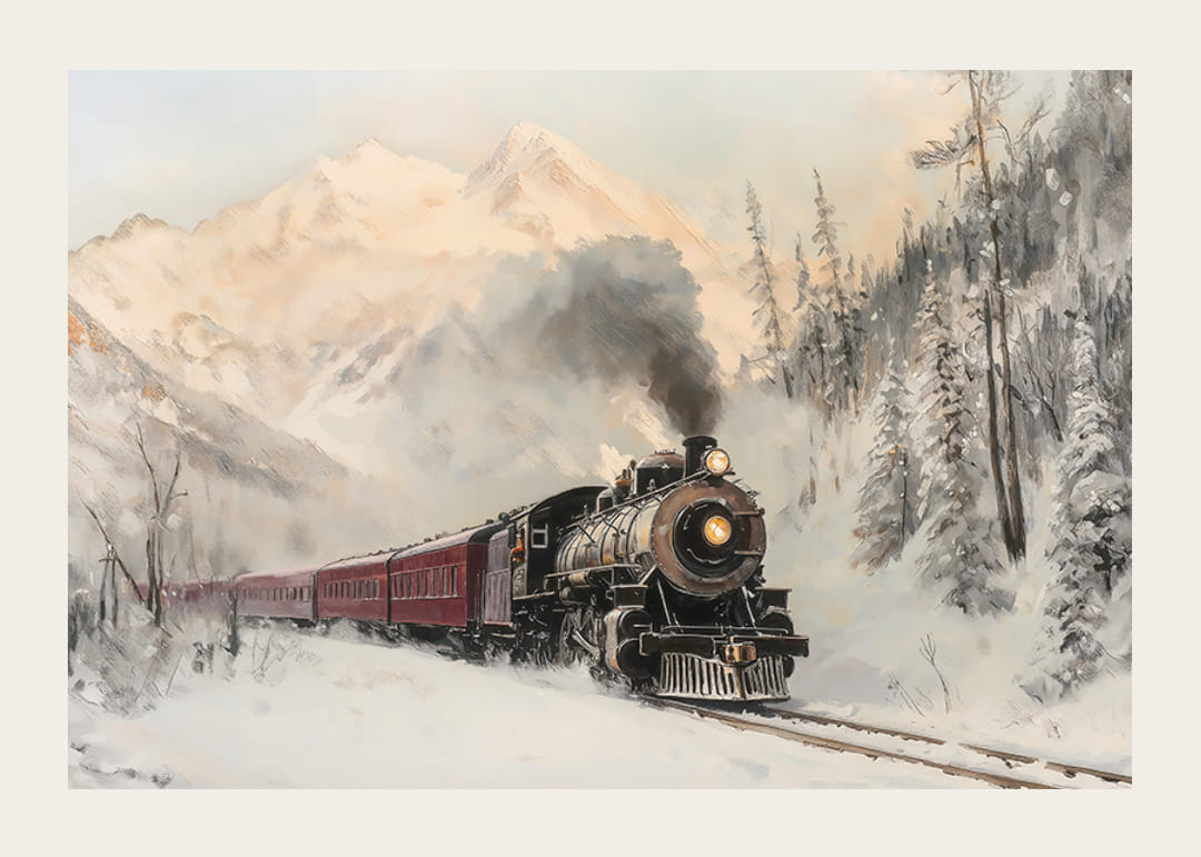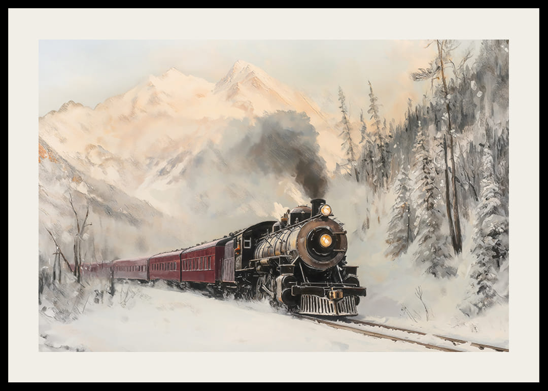 Machen Sie eine nostalgische Reise durch die Winterlandschaft mit diesem Poster, das eine majestätische Dampflokomotive zeigt, die durch schneebedeckte Berge fährt. Das Bild fängt sowohl das Abenteuer als auch die Magie einer Winterreise ein, bei der Rauch in den Himmel steigt und Schnee die Bäume bedeckt. Perfekt, um in Ihrem Zuhause ein Gefühl der Zeitlosigkeit und des Entdeckens zu schaffen, bei dem jeder Blick auf das Poster wie eine Reise in eine andere Zeit und an einen anderen Ort wirkt.
