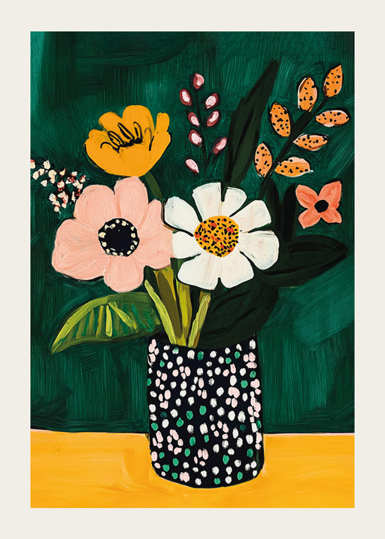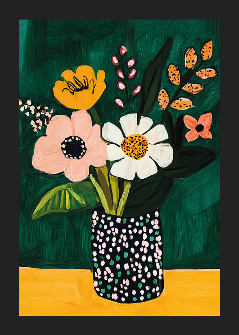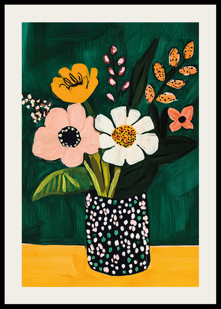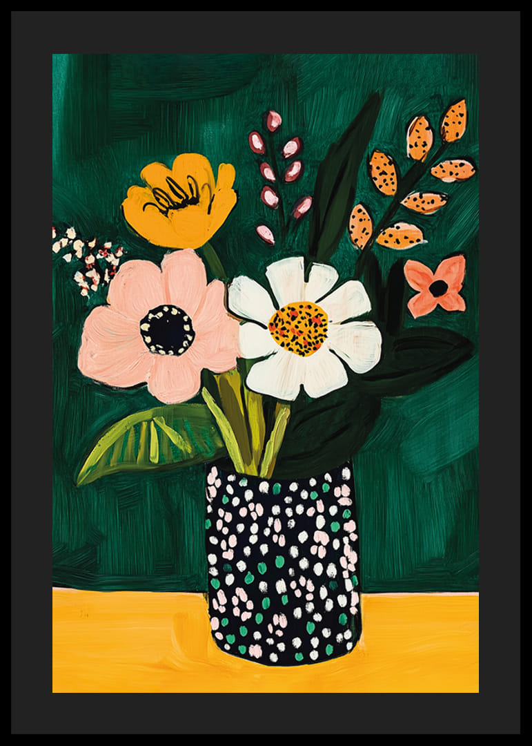 Werten Sie Ihren Raum mit diesem lebendigen Poster auf, das bunte Blumen in einer modernen Vase zeigt. Der tiefgrüne Hintergrund verstärkt die warmen Töne der Blumen und erzeugt einen faszinierenden Kontrast.