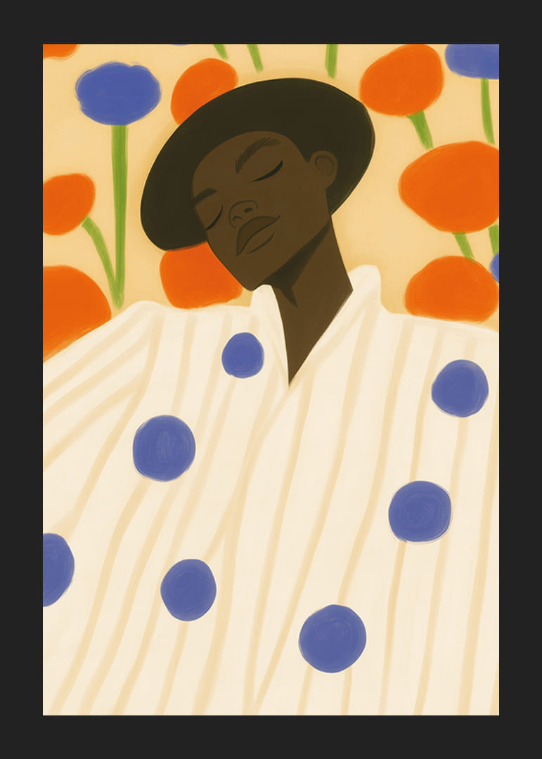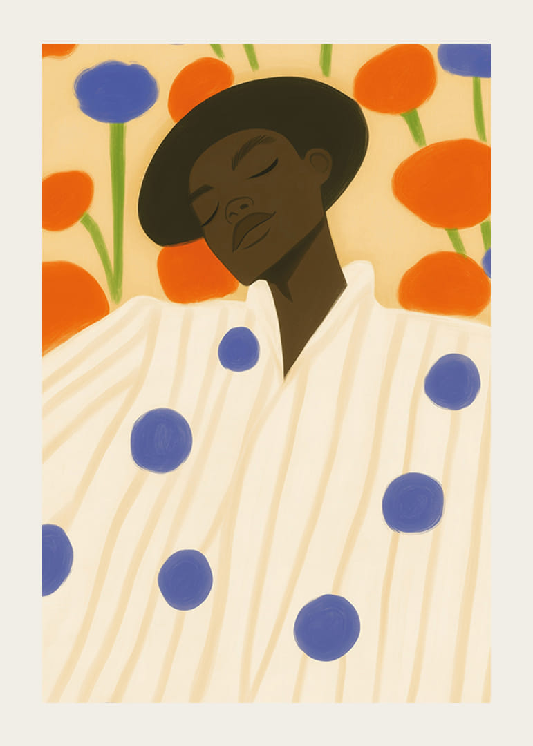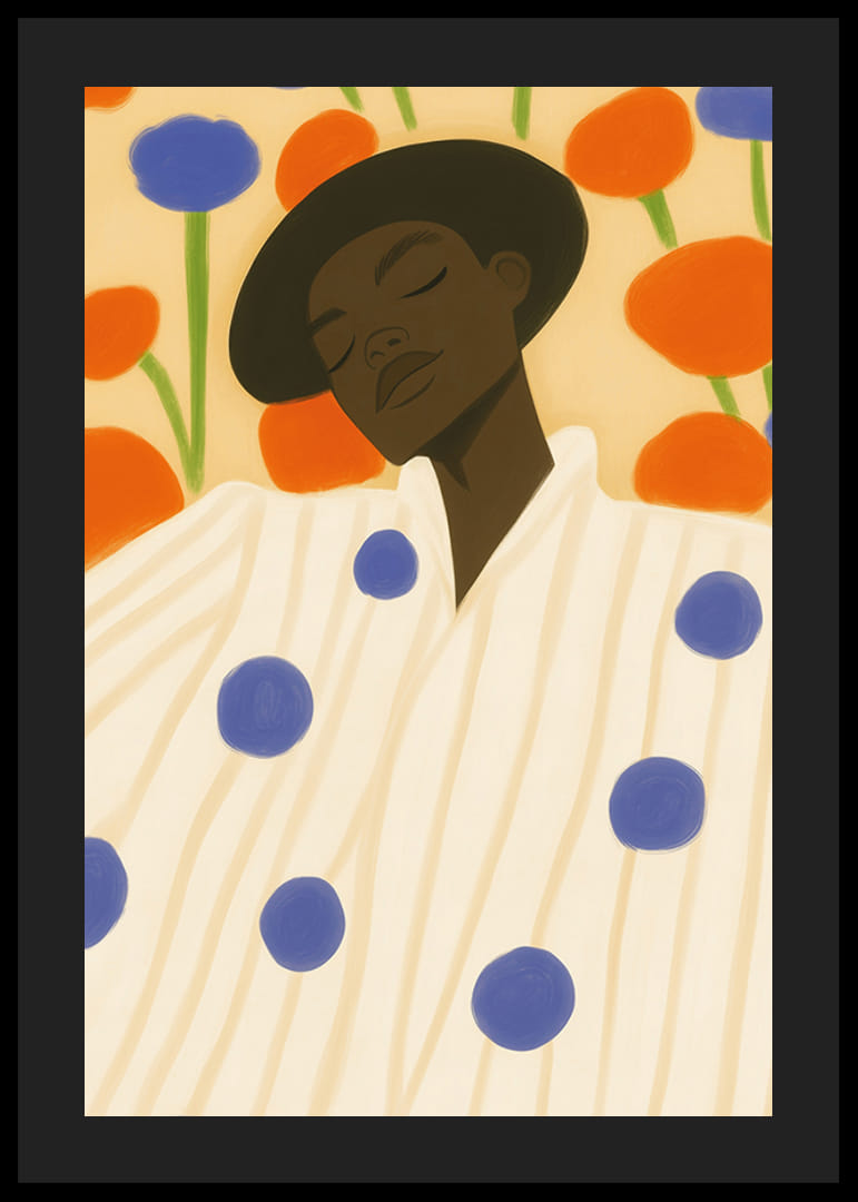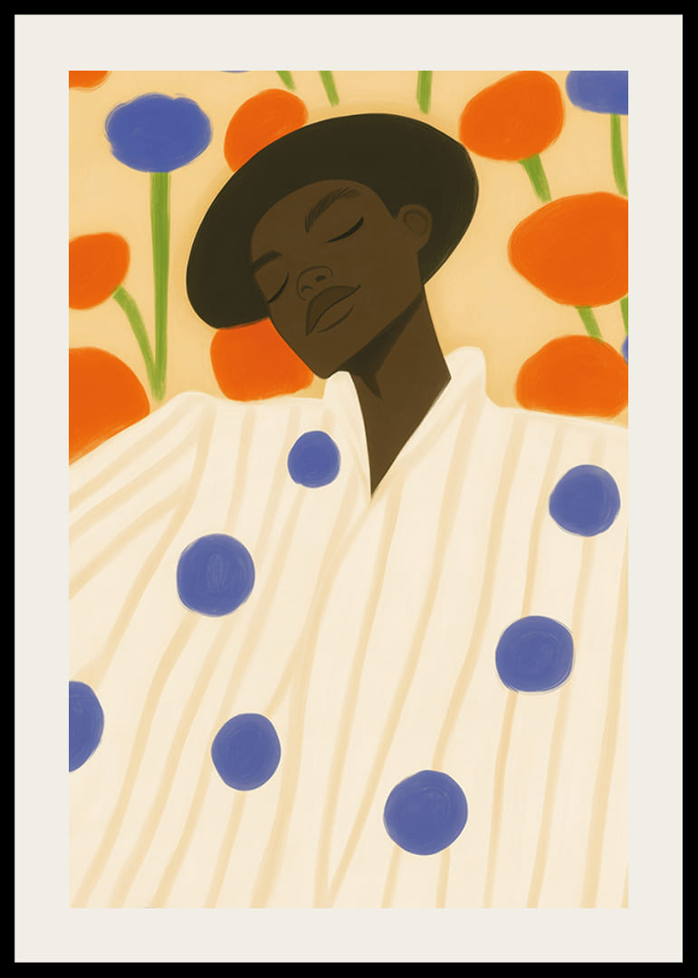 Verlieren Sie sich in diesem verträumten, farbenfrohen Poster, auf dem Mode und Natur in perfekter Harmonie aufeinandertreffen. Eine gefühlvolle Figur ruht vor einem Hintergrund aus großen, verspielten Blumen in intensiven Orange- und Blautönen. Dieses Kunstwerk vermittelt sowohl Ruhe als auch Lebendigkeit.