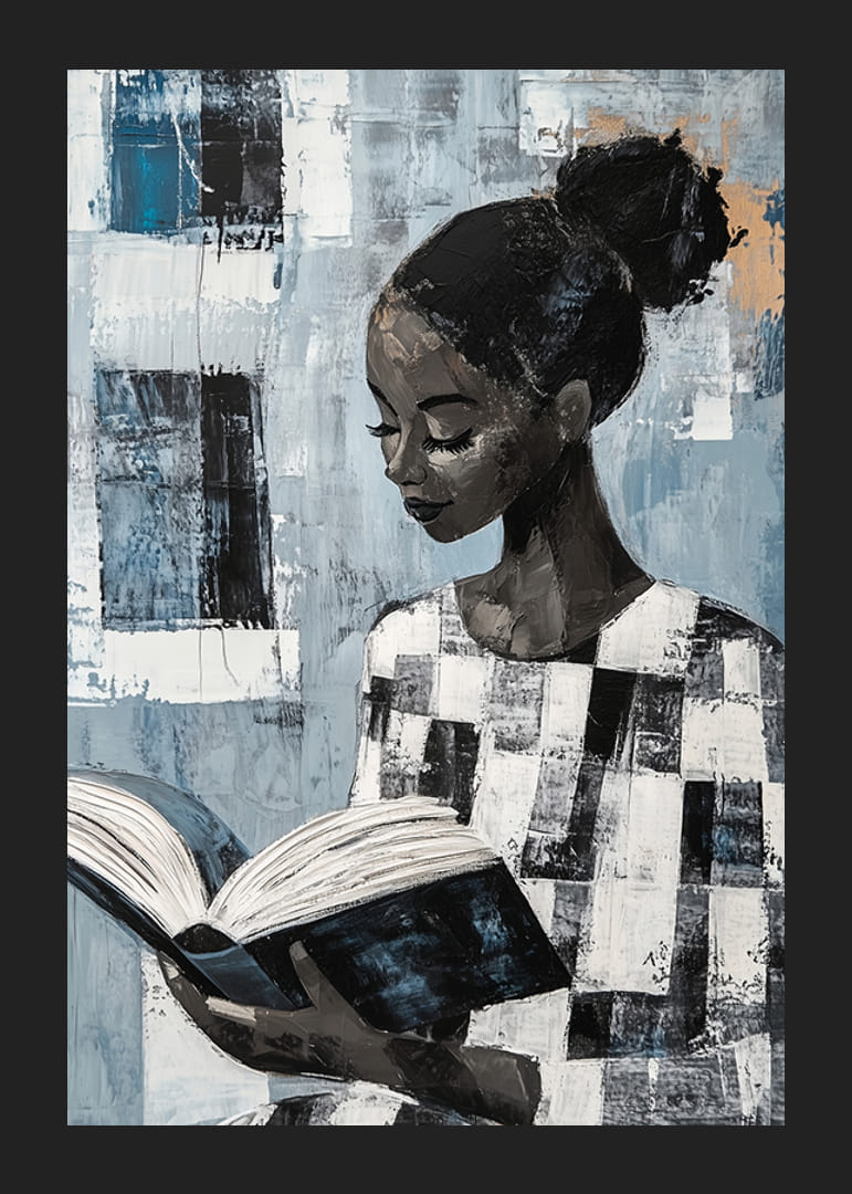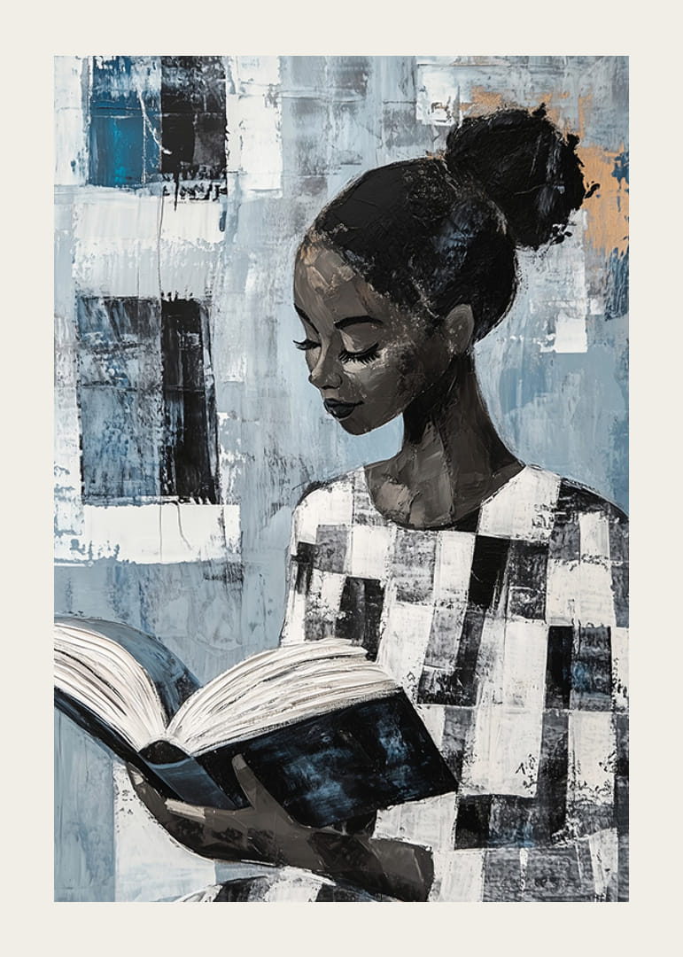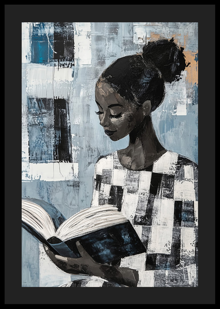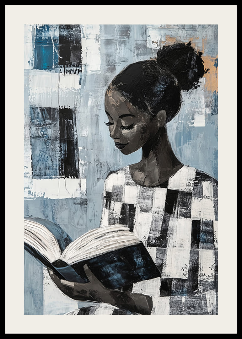 Dieses Poster fängt die heitere Schönheit einer Frau ein, die in einem Buch versunken ist. Die sanften Blau- und Grautöne schaffen eine ruhige Atmosphäre und die abstrakten Details vertiefen das Geheimnis, das ihre Gedanken umgibt. Der konzentrierte Ausdruck der Frau lädt zum Nachdenken und zur Selbstbetrachtung ein.
